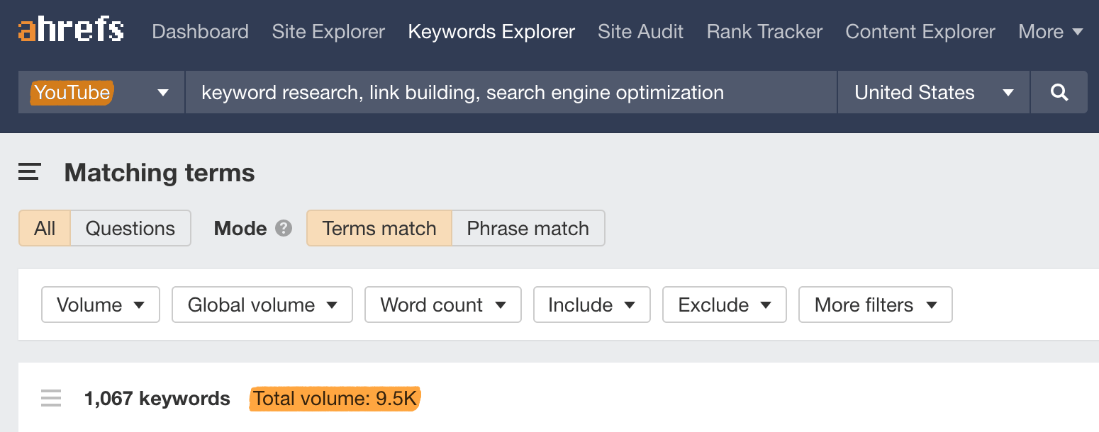 Tu investigación de mercado debería haber descubierto la respuesta a esta pregunta, pero si no estás seguro, considera preguntar o encuestar directamente a tus clientes. De forma alternativa, si consideras tu blog/web o canal de YouTube como uno de tus medios de marketing, usa una herramienta de keyword research como Keywords Explorer de Ahrefs para ver si la gente está buscando temas relacionados con tu negocio.
