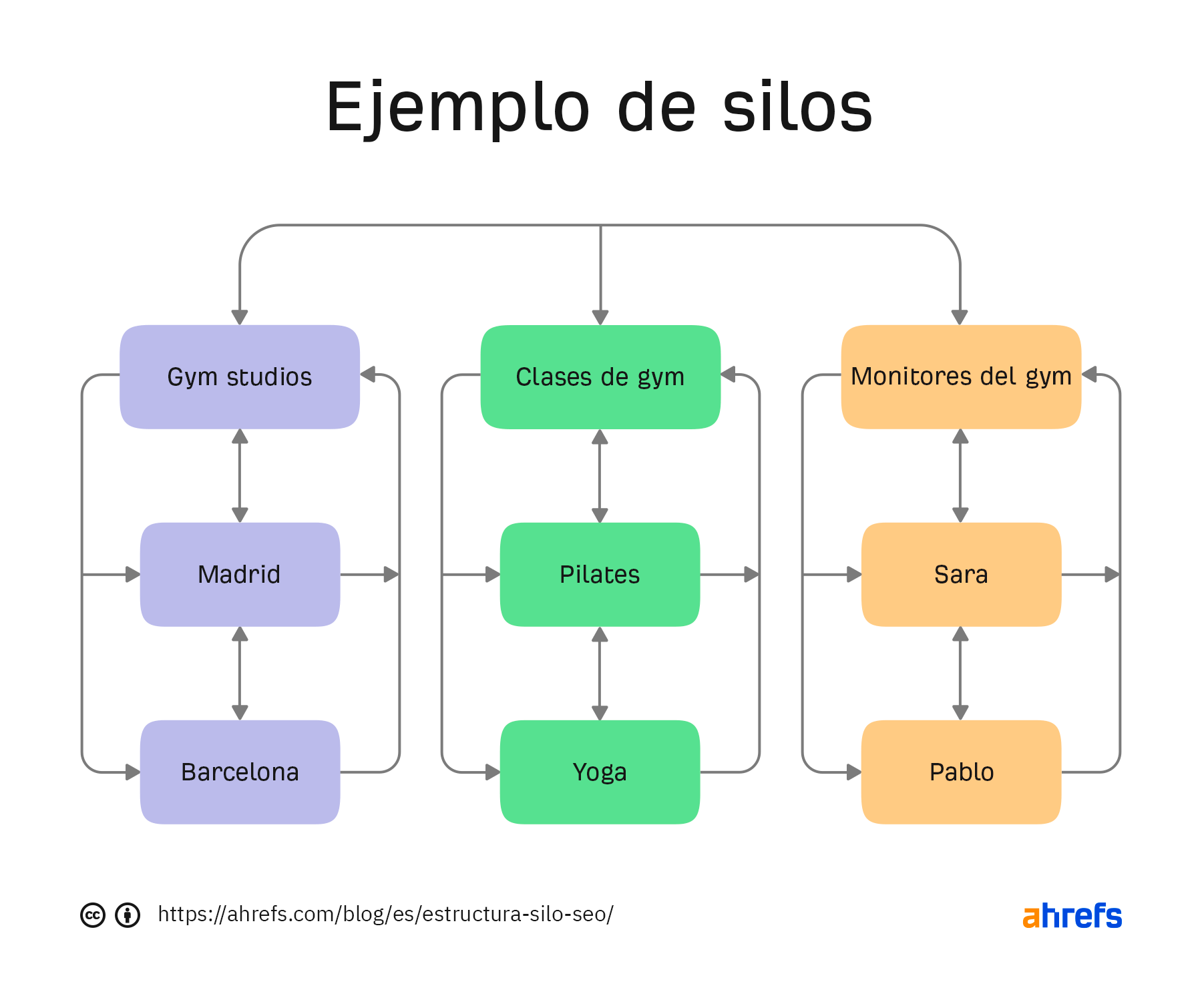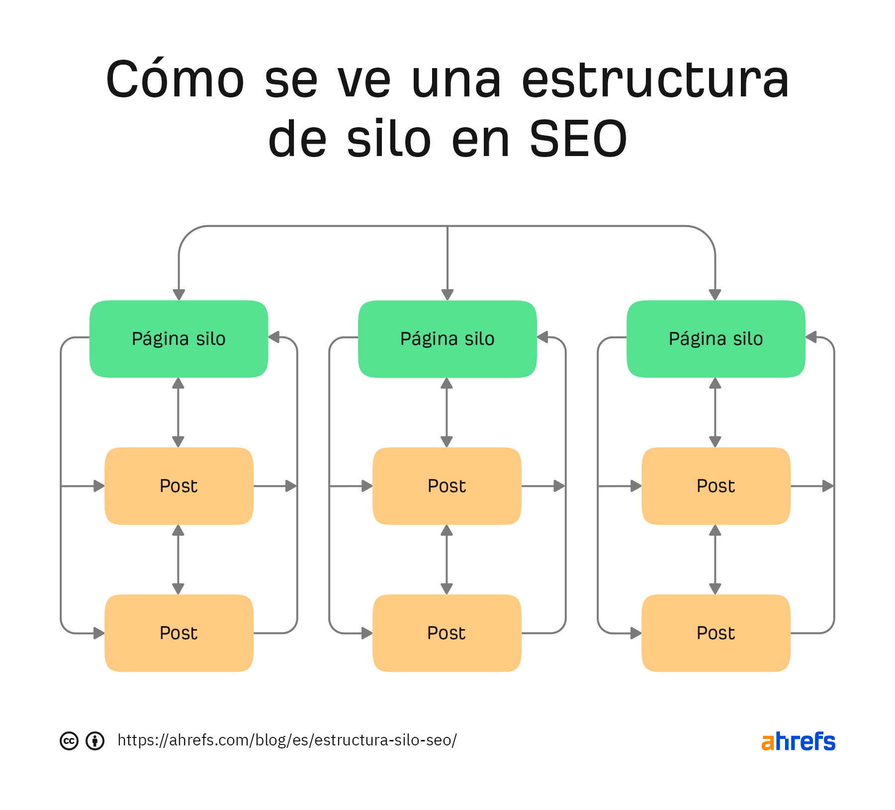 La estructura silo en SEO es un tipo de arquitectura web donde se agrupa, aísla e interconecta contenido sobre un tema específico. Esto crea secciones claras y contenido relacionado diferenciado en una web.