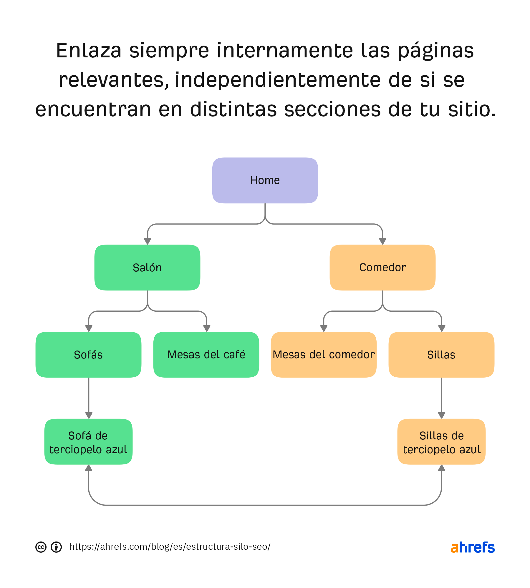Por ejemplo, supongamos que tiene unas sillas de comedor y un sofá del mismo estilo. Puedes enlazar internamente estas páginas a pesar de que se encuentren en diferentes áreas de la web.