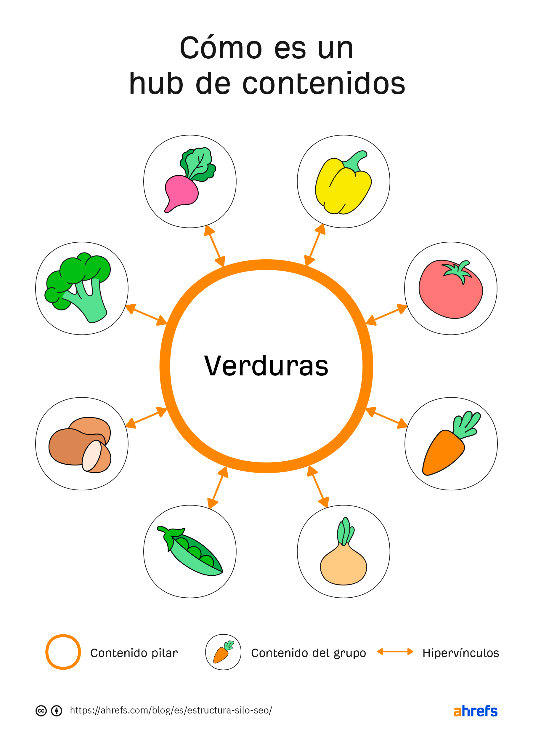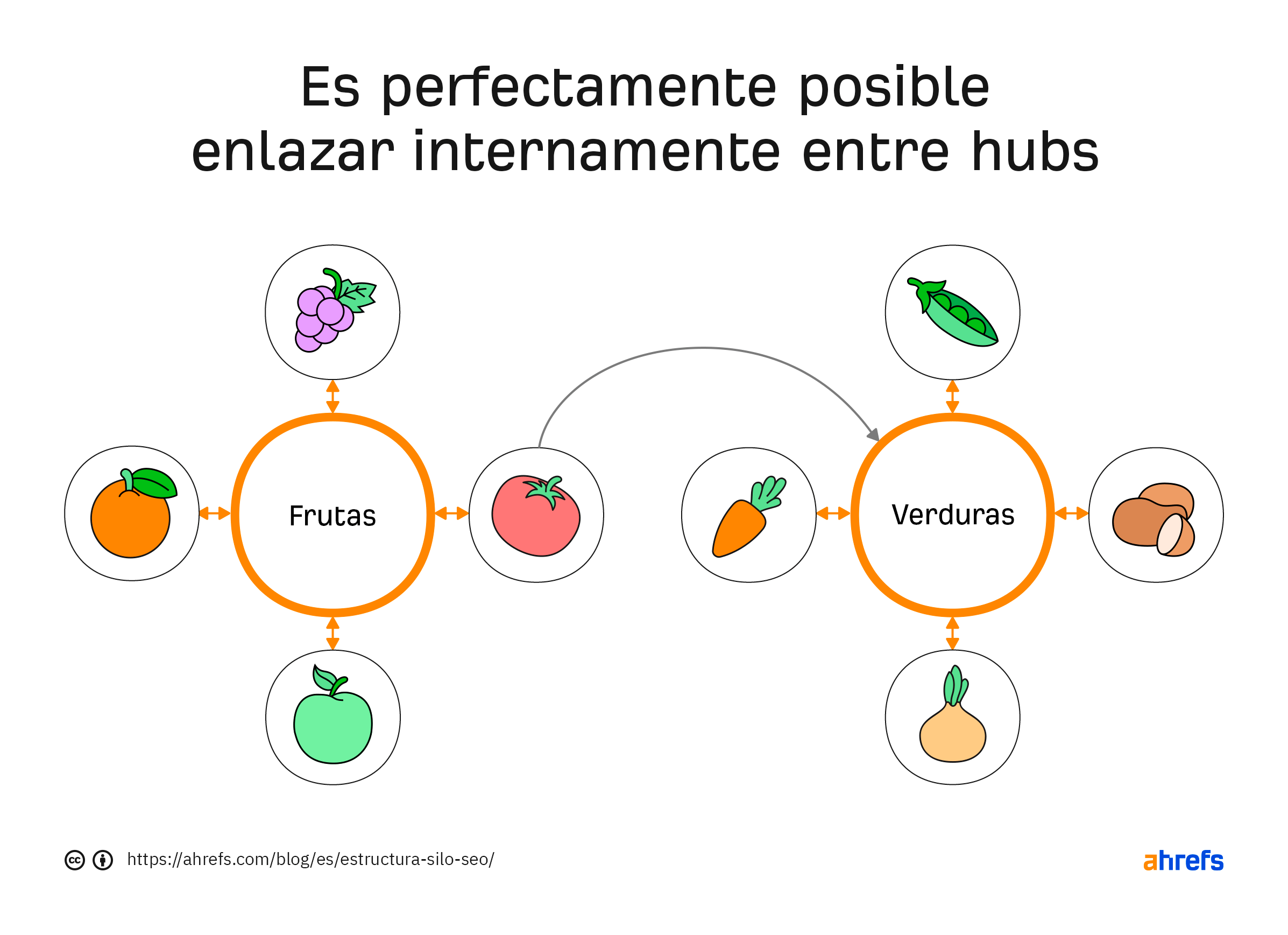 Por ejemplo, digamos que tenemos dos hubs de contenido: uno sobre frutas y otro sobre verduras. Dado que es un error común decir que los tomates son verduras (sí, desde un punto de vista botánico son frutas), puede tener sentido enlazar internamente desde el post sobre tomates a la página del hub de verduras.