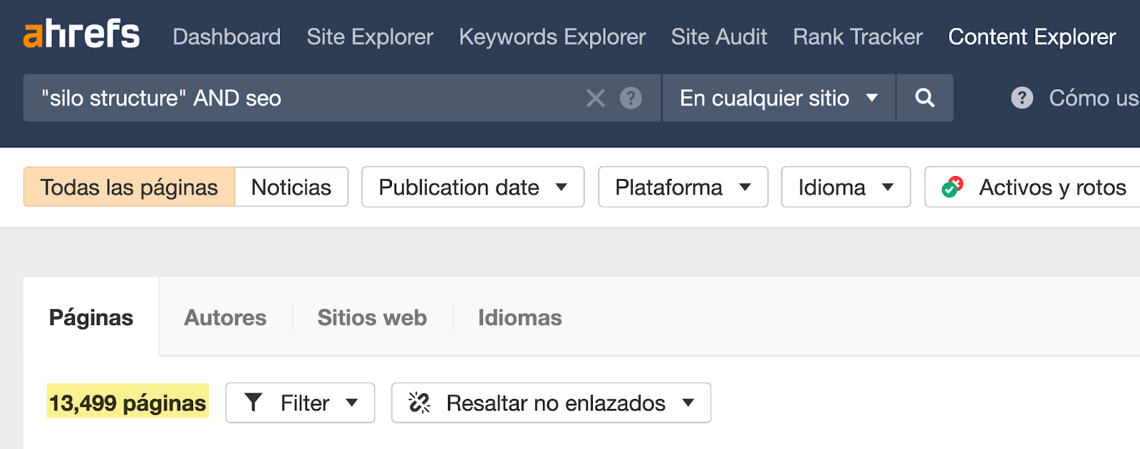 Si hacemos una búsqueda rápida en el Explorador de contenidos de Ahrefs, vemos que hay más de 13.000 páginas publicadas que contienen la frase “silo structure” y la palabra “SEO”.