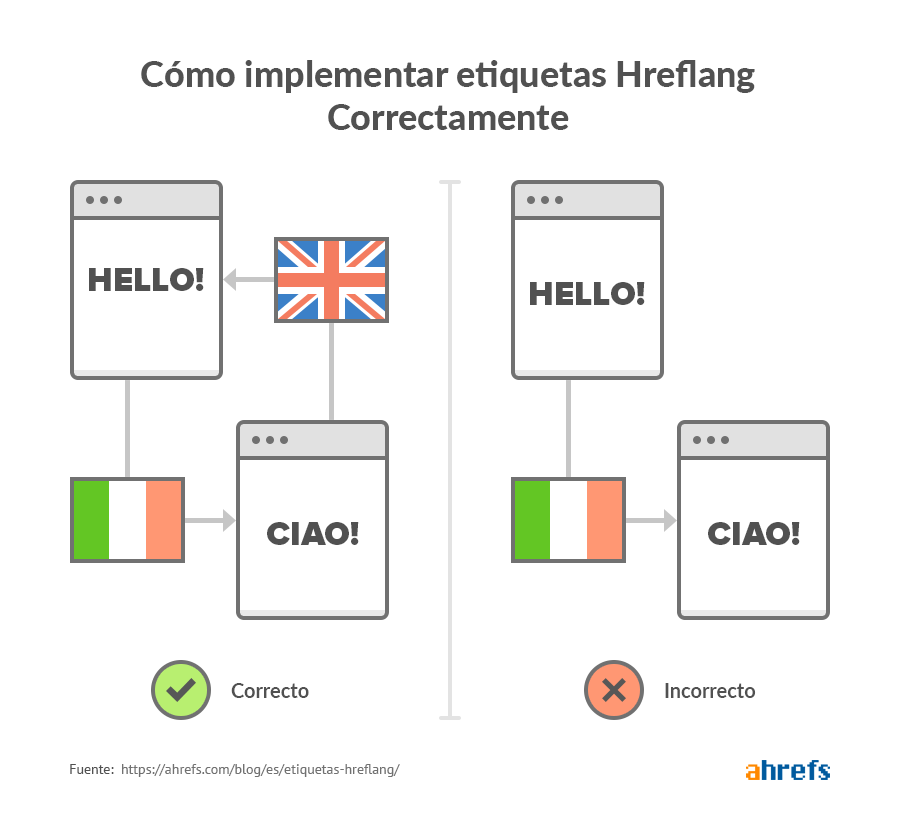 Así, si queremos añadir etiquetas hreflang entre una página en español (https://ejemplo.com/hola) y una italiana (https://ejemplo.com/ciao) cada una de ellas debería tener las siguientes etiquetas hreflang: