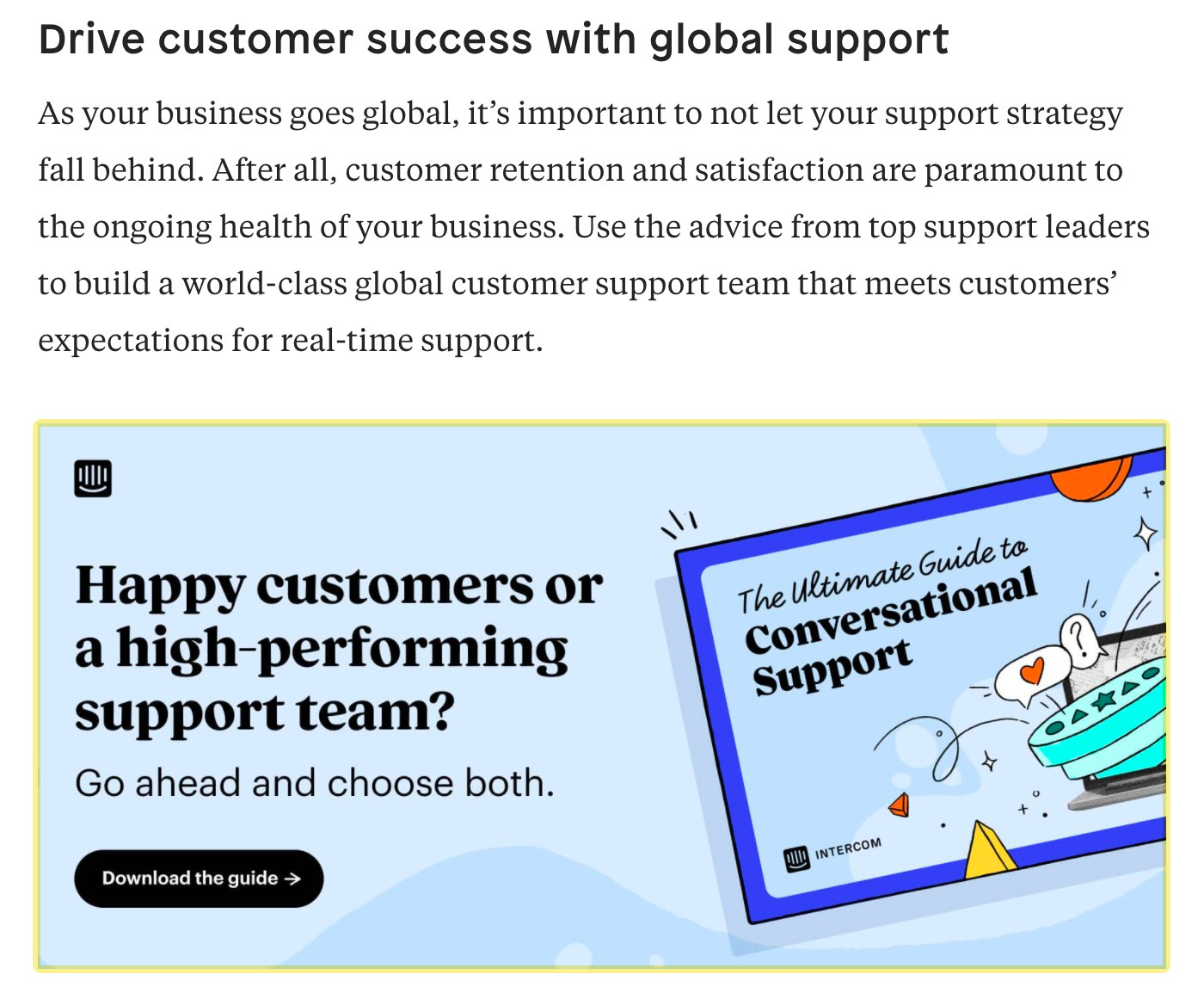 Por ejemplo, Intercom ofrece una “guía final para la atención conversacional” en su post sobre atención al cliente global: