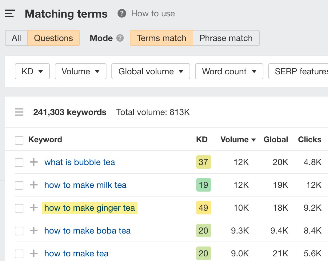 Puedes encontrar estos temas con Keywords Explorer de Ahrefs: