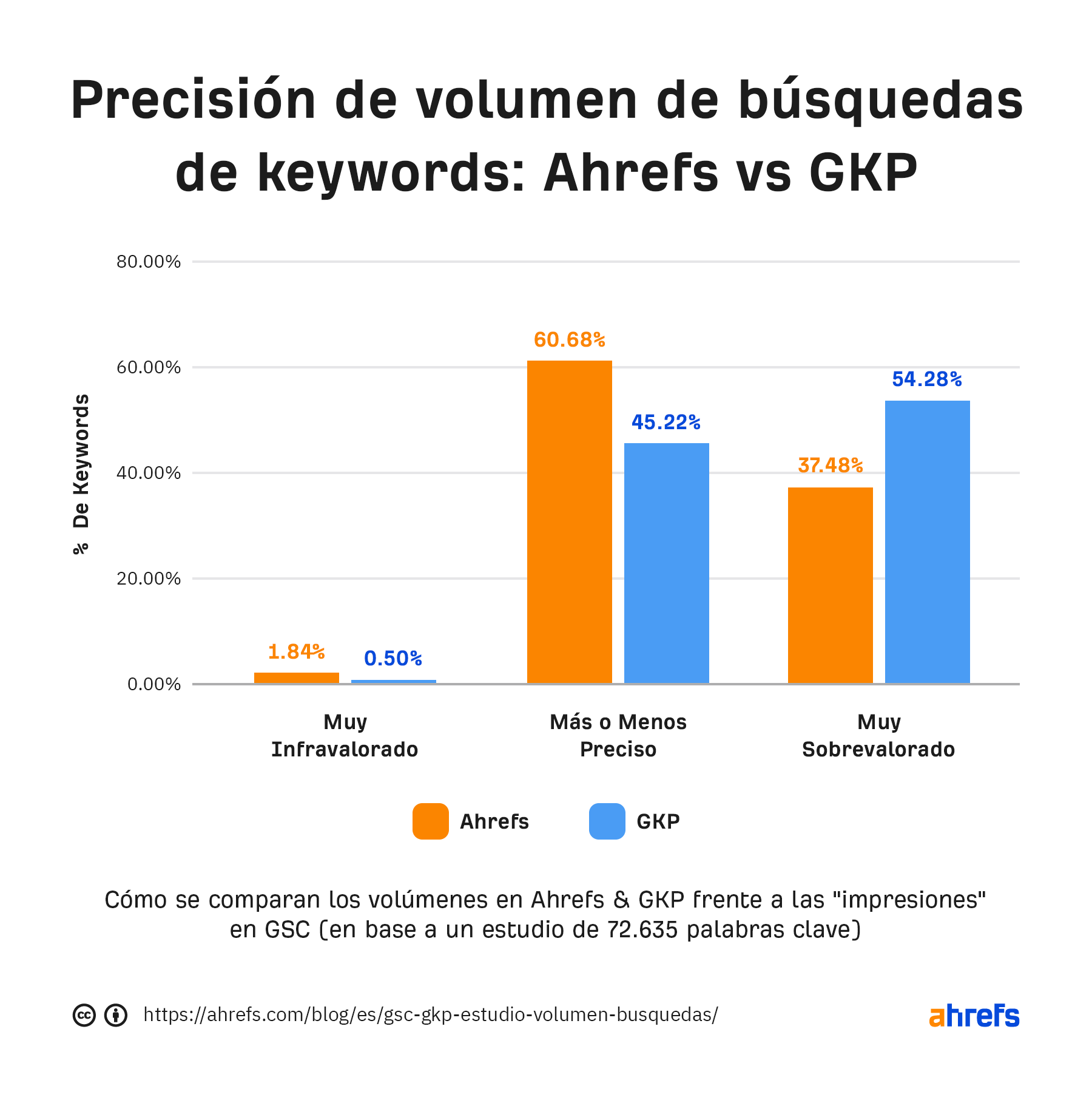 Parece que Ahrefs muestra valores “Más o menos Precisos” en el 60% de los casos frente al 45% de los casos en GKP. Eso se debe sobre todo a nuestra capacidad de “desagrupar” clusters de palabras clave parecidas y reportar distintos volúmenes de búsqueda para cada uno de ellos.