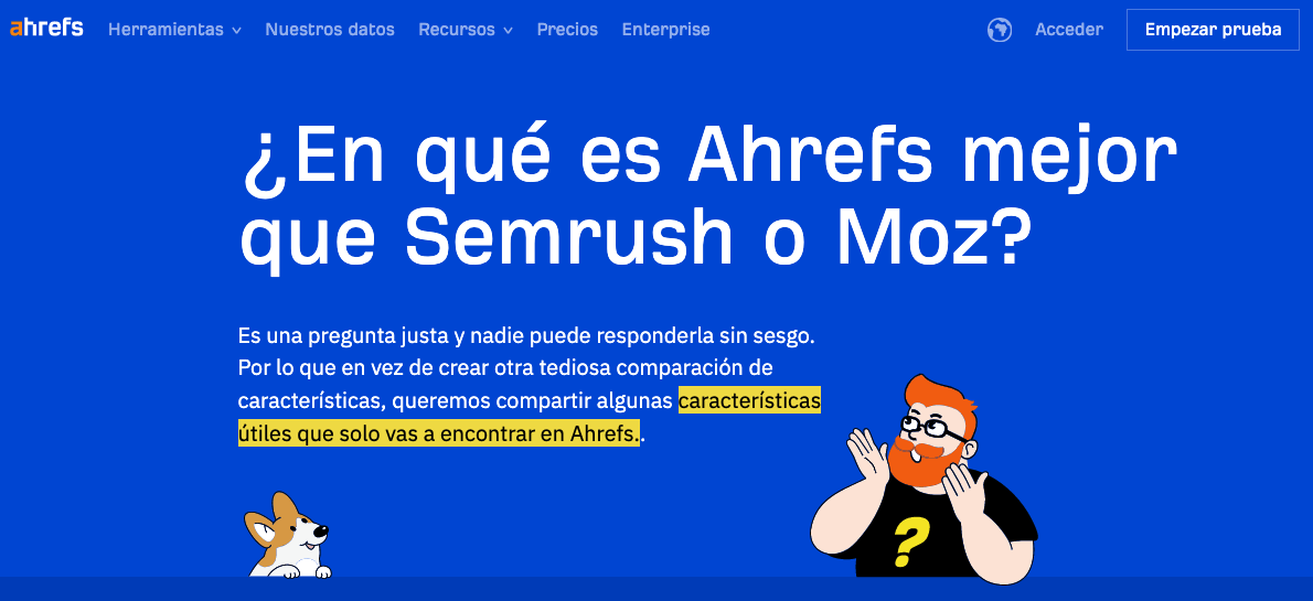 Aquí va un ejemplo nuestro comparando Ahrefs con otras dos herramientas conocidas: