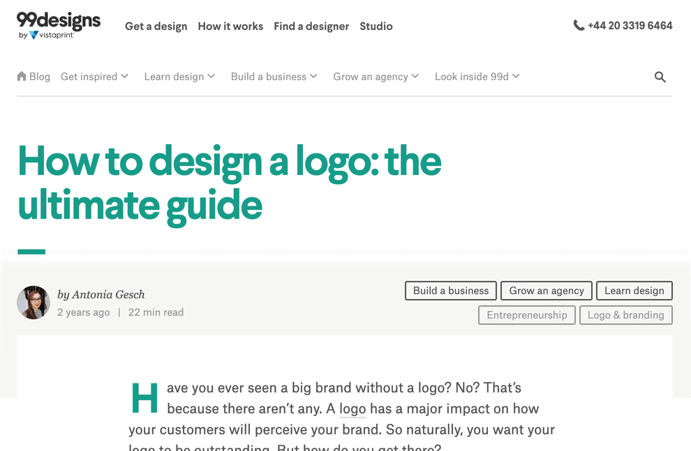 Esta guía posiciona en el puesto #1 por “how to design a logo” (cómo diseñar un logo) y recibe unas 39.900 visitas estimadas al mes desde búsqueda orgánica, según Site Explorer: