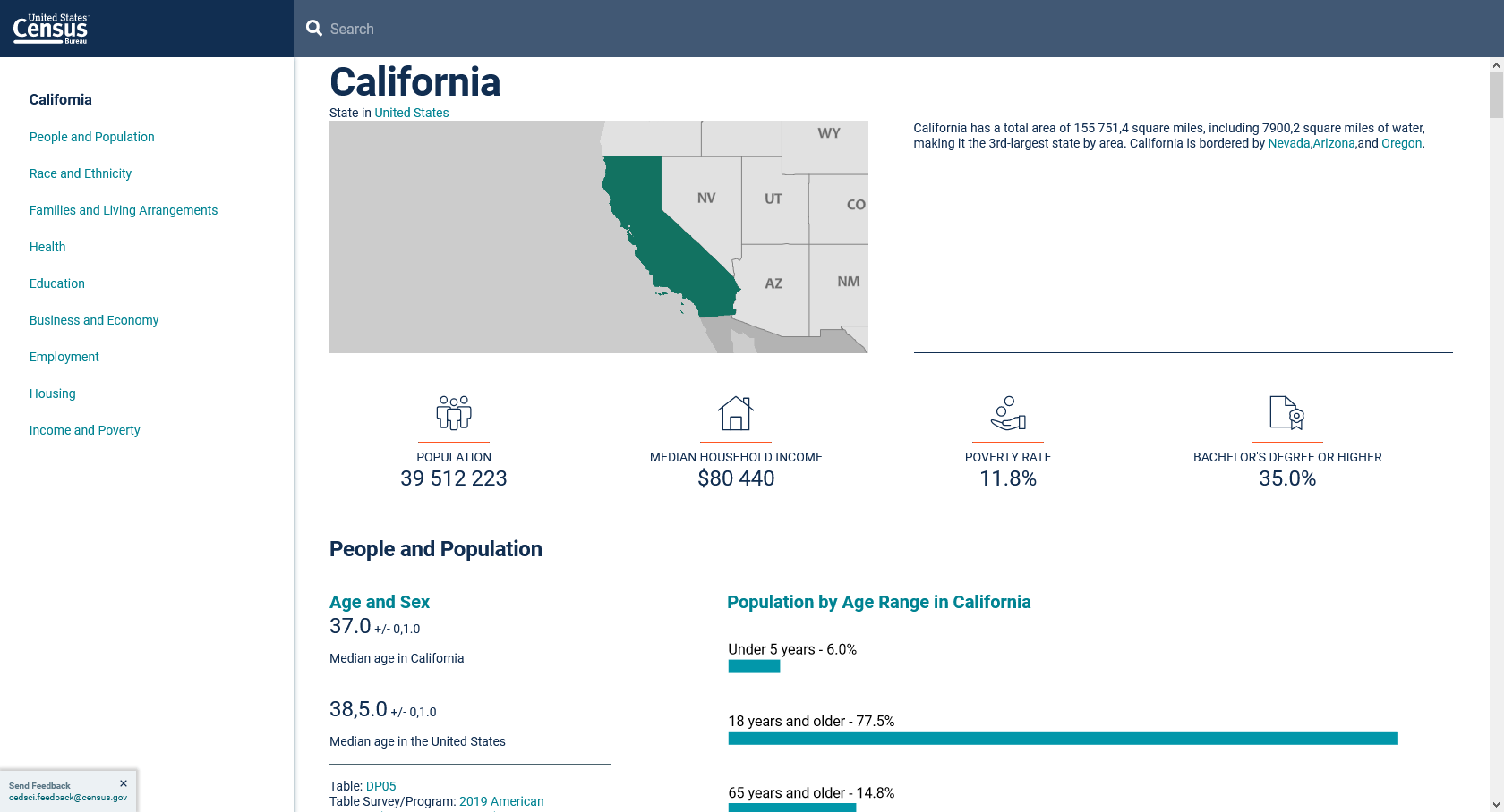 La disponibilidad de este tipo de datos puede variar en base a tu mercado objetivo. Por ejemplo, el Departamento del Censo de Estados Unidos te ofrece suficientes recursos gratuitos para buscar en los datos del censo del país. Puedes filtrar los datos por temas, años, geografía, encuestas o códigos de industria. También puedes acceder a tablas interactivas prefabricadas (que también te puedes descargar) o simplemente explorar ciertas regiones del país usando sus mapas.