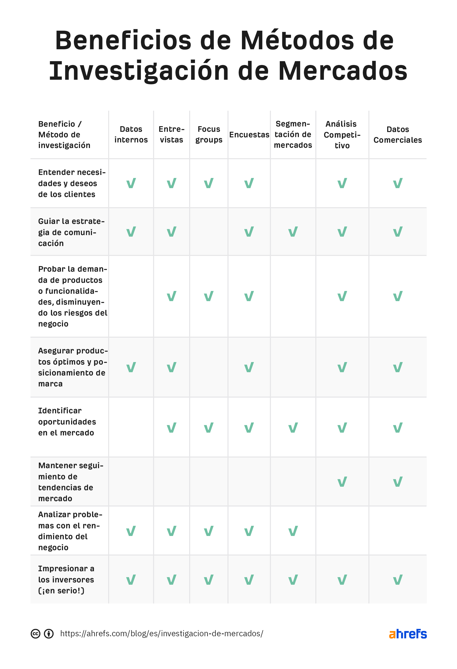 Vamos a resumir rápidamente los 7 métodos de investigación de mercados que hemos visto arriba por sus beneficios clave.