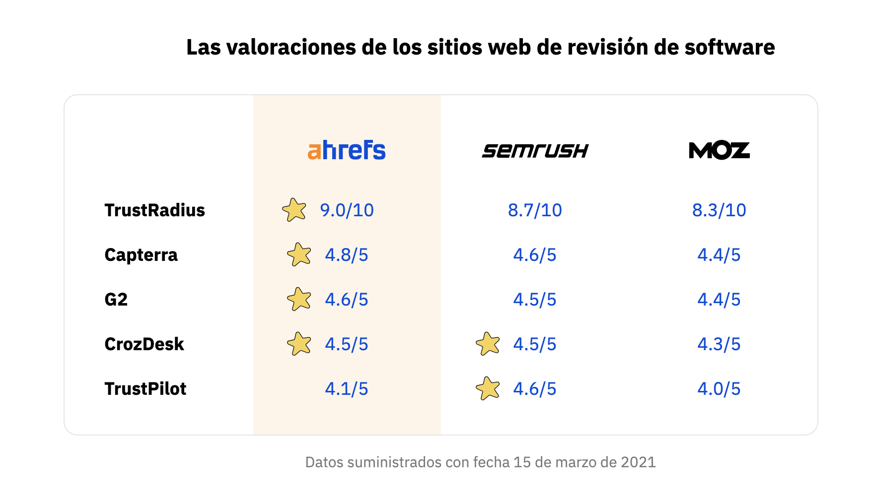 Sitios como G2, Capterra y Trust Pilot también cuentan. No solo te dan una perspectiva general de tu sector, si no que también puedes encontrar auténticas perlas en las reviews de usuario de tu producto y las de tu competencia. Ahrefs usa esos datos de forma habitual, interna y externamente, como en esta sección de nuestra página landing Ahrefs vs Semrush vs Moz: