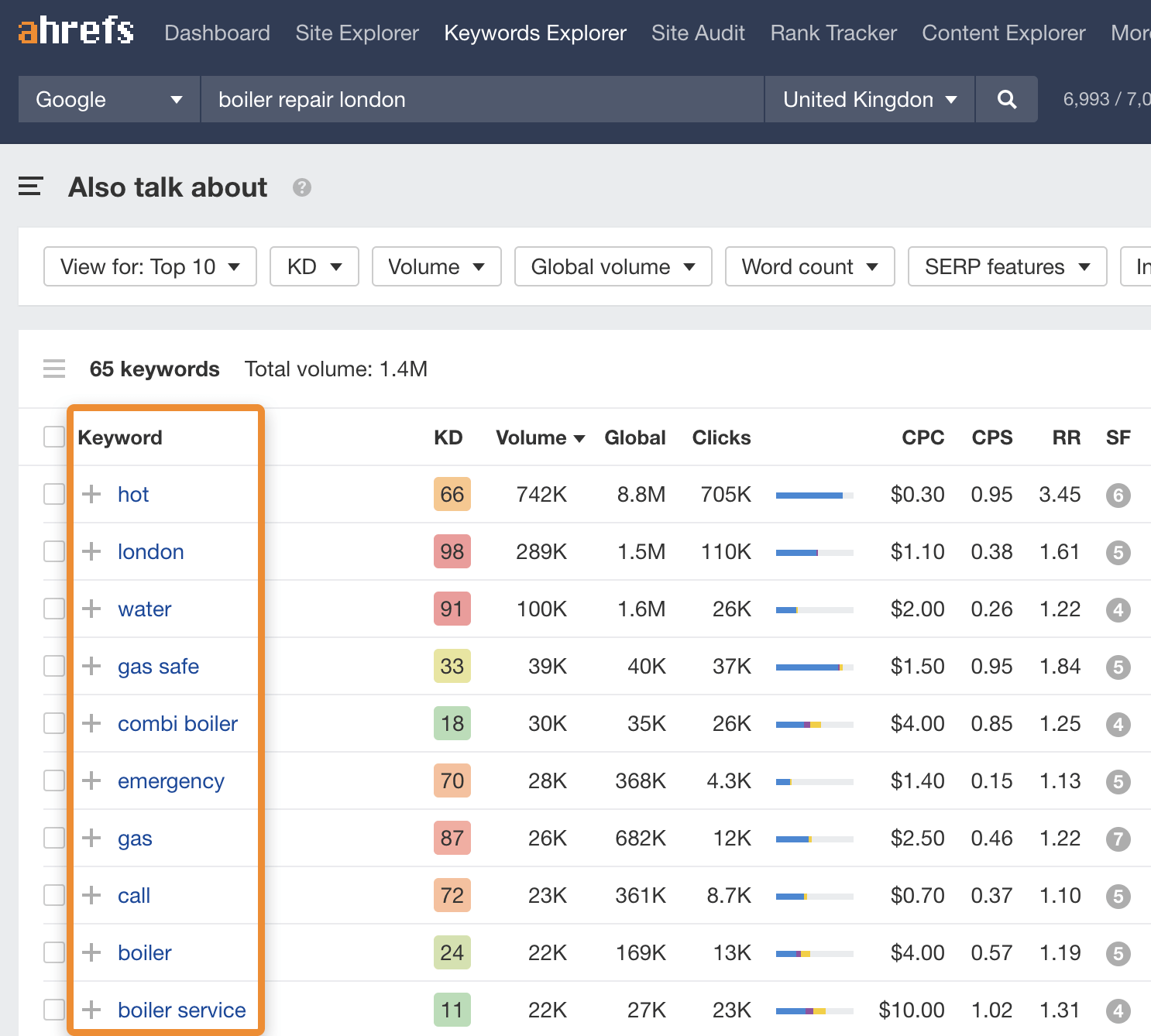 Con las palabras clave explícitas no necesitas usar Google Keyword Planner porque la propia consulta te dice la ubicación del usuario. Así que puedes usar una herramienta de keyword research como Keywords Explorer para conseguir volúmenes de búsqueda más precisos para estas keywords.