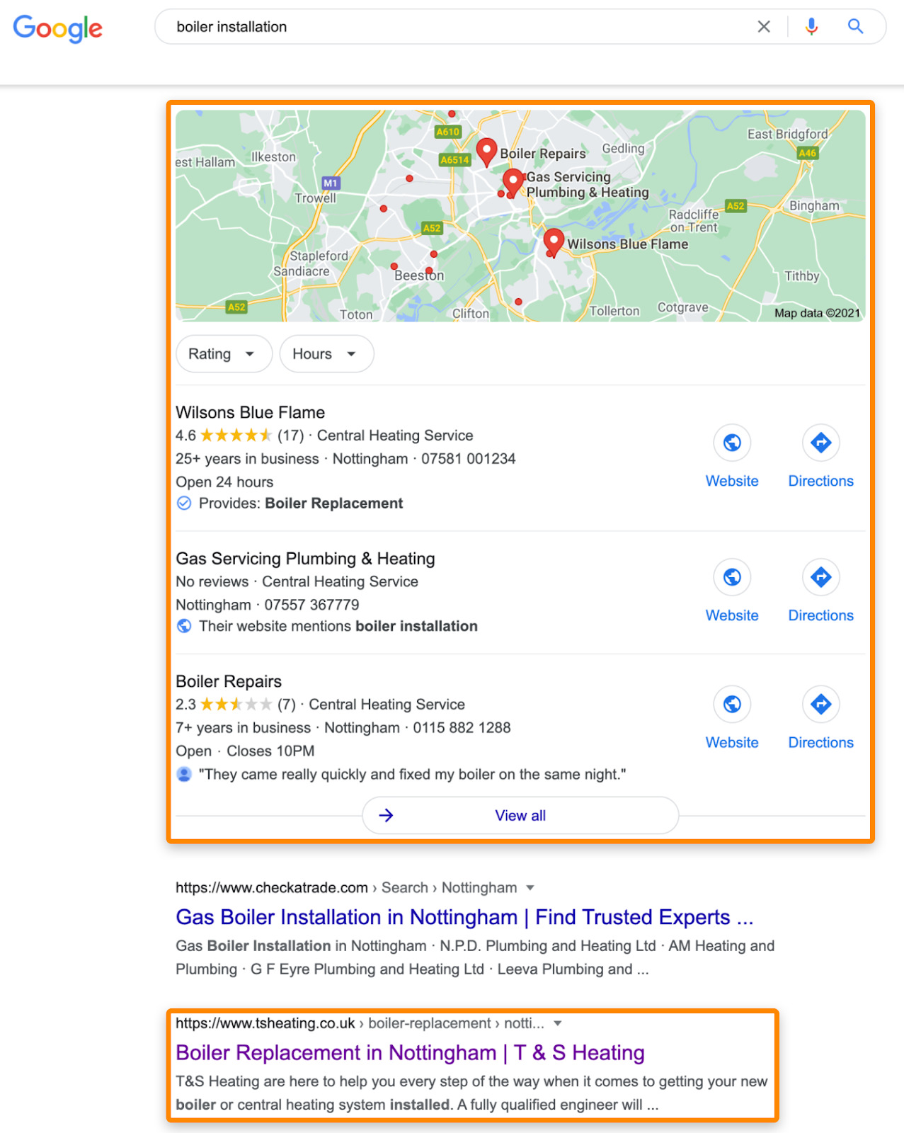Por ejemplo, si buscamos “boiler installation” (instalación de calentador), vemos un pack de mapas y unos pocos negocios locales en los resultados de búsqueda porque esta palabra clave tiene intención local.