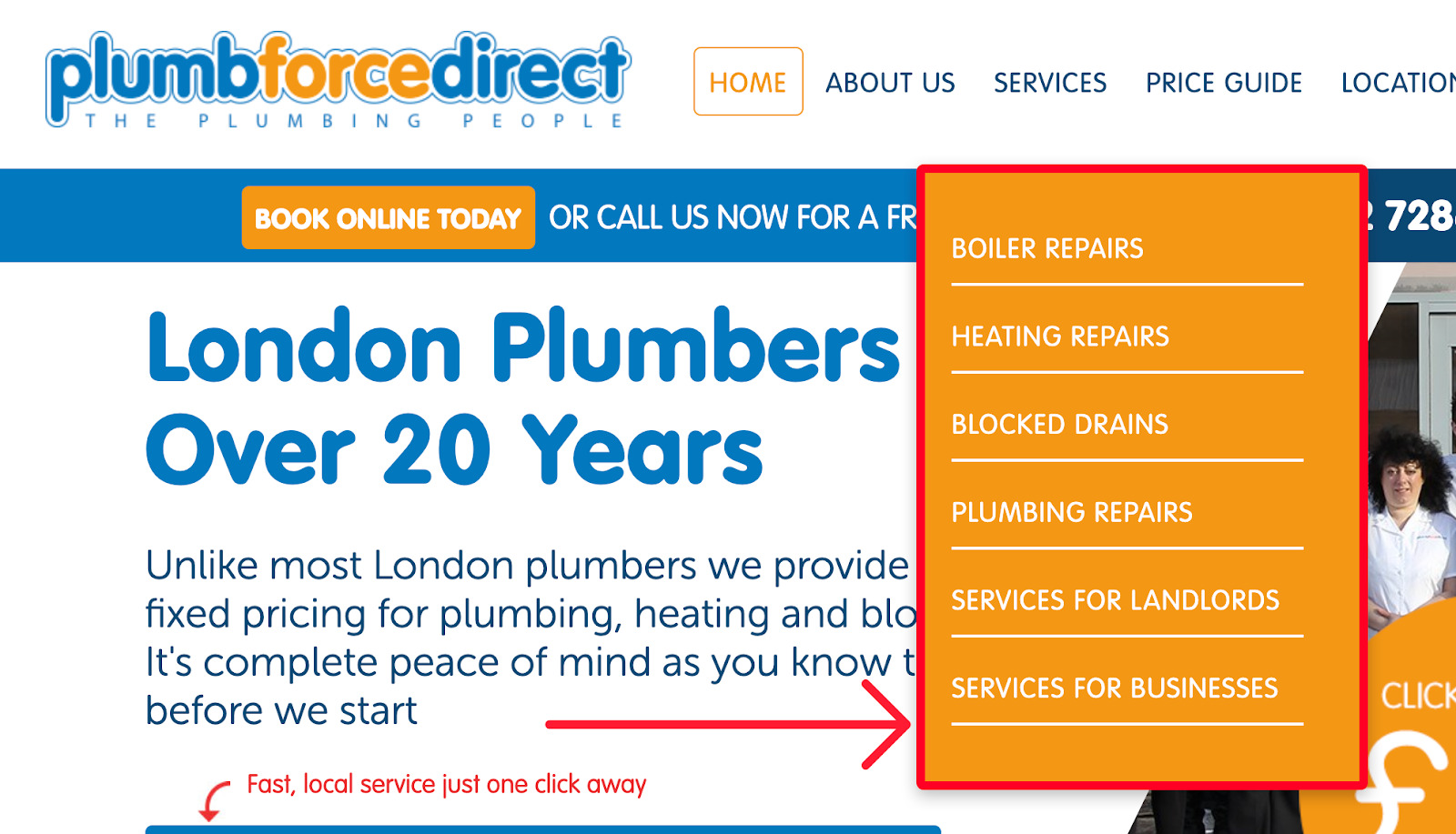 Así que parece que probablemente merezca la pena mencionar los tipos de calentadores que reparamos (gas, combi), si ofrecemos precio fijo y si estamos disponibles para llamadas de emergencia.