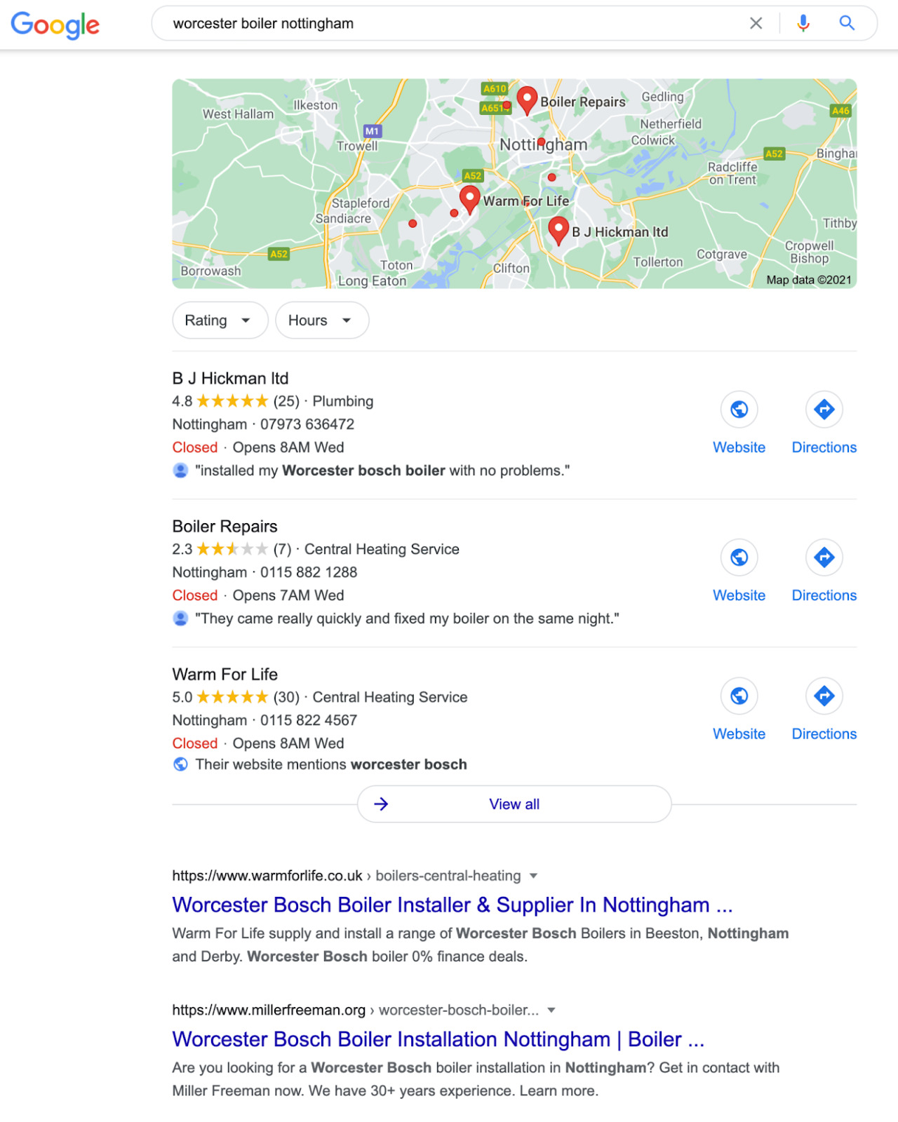 Por ejemplo, la búsqueda implícita “calentador worcester” no tenía una intención local—pero la búsqueda explícita (“worcester boiler nottingham”, calentador worcester nottingham) lo tiene: