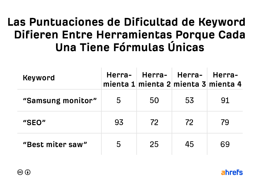 También es importante entender que cada herramienta SEO usa una fórmula propia para su puntuación de dificultad de keyword, eso es por lo que las puntuaciones de herramienta a herramienta presentan diferencias tan grandes.