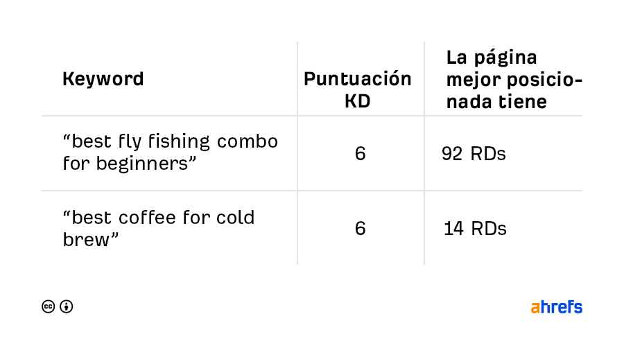 Como conclusión, manteniendo el resto de factores igual, probablemente sería más fácil desbancar la página con 92 RDs que la página con 14 RDs. Así que a pesar de tener la misma puntuación de KD, es discutible que “best coffee for cold brew” (mejor café para café en frío) sea una palabra clave con menos competencia que “best fly fishing combo for beginners” (el mejor combo de caña y carrete para principiantes).