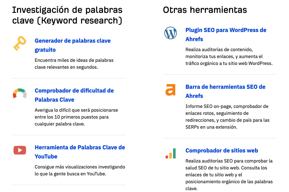 Hacer que tu contenido sea práctico implica crear algo que el lector pueda usar en ese mismo instante. Algunos ejemplos pueden ser herramientas, calculadoras, plantillas, checklists y cheat sheets. Por ejemplo, en Ahrefs hemos creado un grupo completo de herramientas gratuitas.