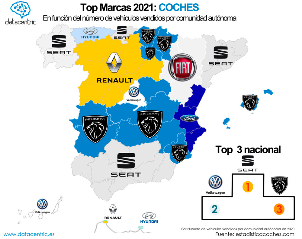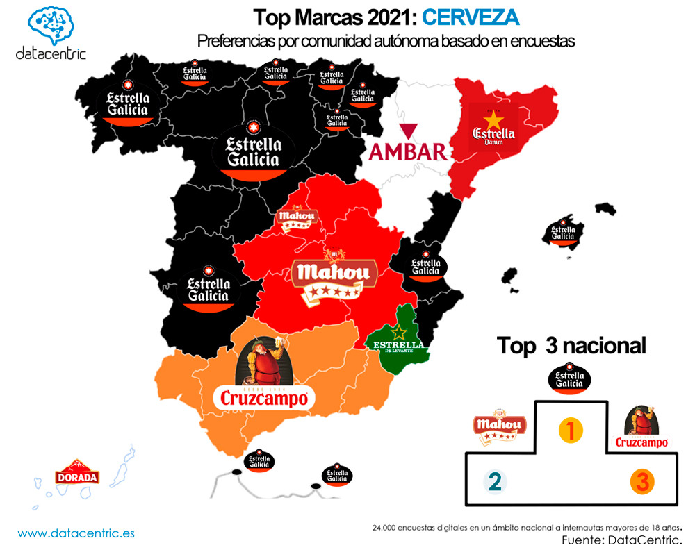 Por ejemplo, echa un vistazo a este post que analiza el consumo de marcas en España en función de su comunidad autónoma, incluyendo cervezas, marcas deportivas, bancos, moda y mucho más. Cada sector cuenta con un mapa de España donde podemos ver las marcas más populares en cada comunidad: