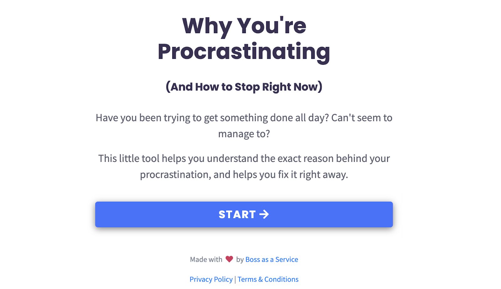 - Una visión distinta a la habitual: el quiz te ofrece sugerencias accionables y sin juicios de valor sobre cómo resolver el problema específico que has diagnosticado con el quiz. Muchos estamos acostumbrados a ver la procrastinación con culpa y sentimientos negativos asociados con ella, así que una solución basada en la “ecuación de la procrastinación”, que básicamente ve la procrastinación como una ecuación, con varias partes que pueden incrementarse o disminuir para fijar el problema de la procrastinación, es novedosa y poco común. (El quiz está basado en un libro titulado “La Ecuación de la Procrastinación”).