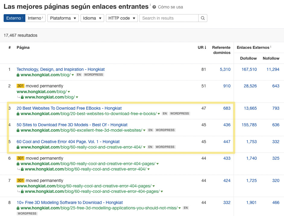 Echa un vistazo a la lista para ver qué tipo de formatos y temas conectan con las personas en tu nicho. Por ejemplo, si hacemos esto con el blog de Hong Kiat, vemos que los listicles o post tipo listado son populares en el nicho de diseño.