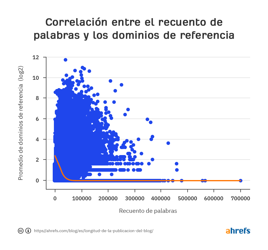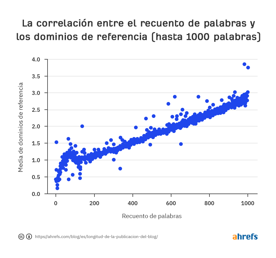 Echa otro vistazo al gráfico de arriba y verás que se corta en 1,000 palabras. Para las publicaciones más largas, encontramos una fuerte correlación negativa entre el recuento de palabras y los enlaces externos. En otras palabras, el número promedio de backlinks de sitios web únicos (dominios de referencia) comienza a disminuir después de 1,000 palabras.