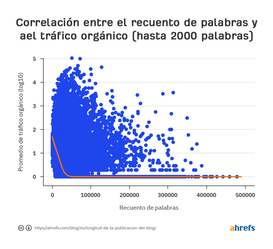Si echas otro vistazo al gráfico anterior, notarás que se corta en 2000 palabras. Esto se debe a que encontramos una correlación negativa moderada entre el recuento de palabras y el tráfico orgánico para publicaciones de más de 2000 palabras. En otras palabras, la publicación promedio de 10,000 palabras recibe menos tráfico de búsqueda que la publicación promedio de 2,000 palabras.