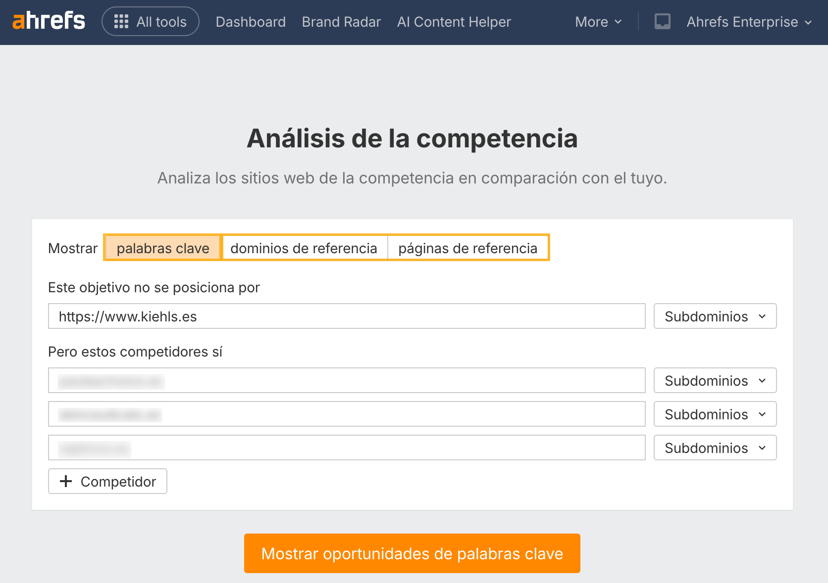 Por otro lado, la herramienta de “Análisis de competencia” de Ahrefs les permite hacer una comparativa de las palabras clave por las que otros competidores están posicionando y ellos no, al igual que las páginas y dominios que están enlazando a la competencia y a ellos no.