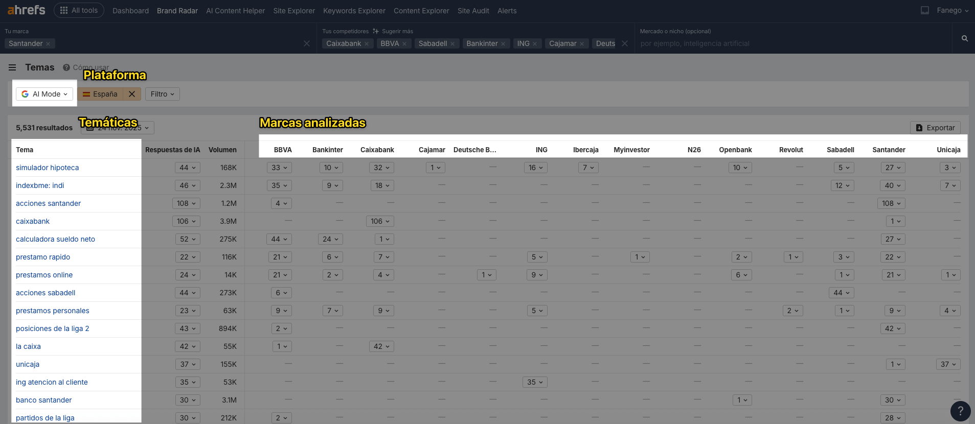 Hay algún tema que tendríamos que investigar, como “hipoteca”, donde sí están Bankinter, Caixabank o ING, pero no Santander: