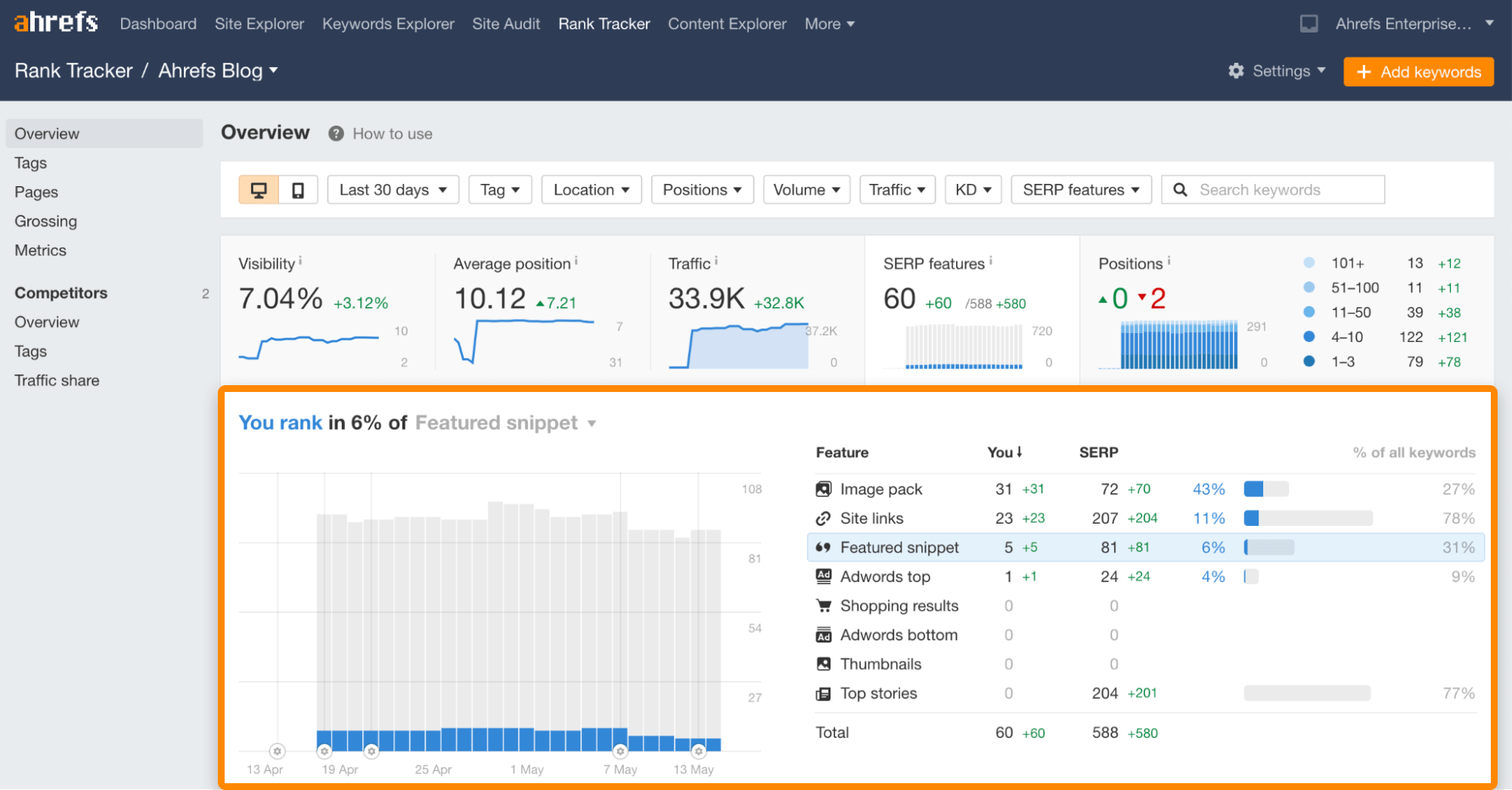 Muchos rank trackers te dan esta capacidad, incluyendo el Rank Tracker de Ahrefs, que automáticamente monitoriza la relevancia y propiedad de la mayoría de funcionalidades SERP para las palabras clave monitorizadas.