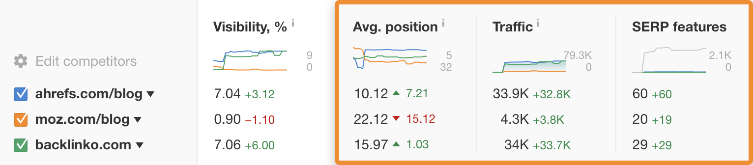 Es una historia similar para las posiciones promediadas de ranking, tráfico y funcionalidades SERP:
