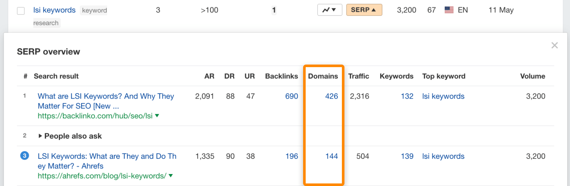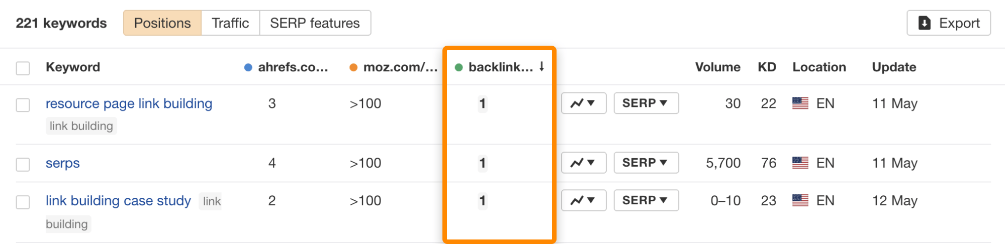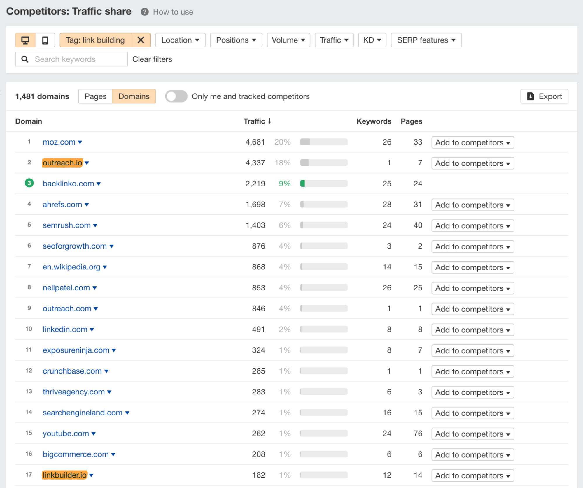 Por ejemplo, si filtramos por nuestra etiqueta de “link building”, vemos un par de competidores que no aparecieron antes como outreach.io y linkbuilder.io.