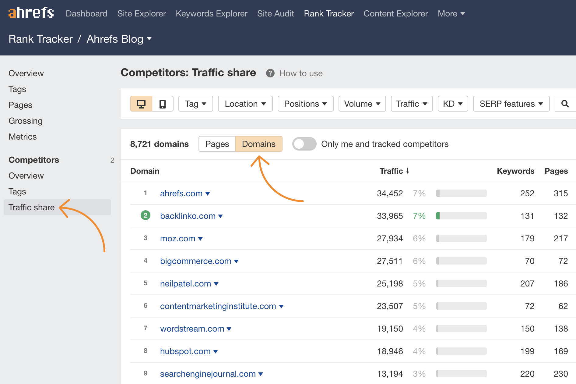 Para encontrar rápidamente a estos competidores, dirígete al informe de Traffic share (cuota de tráfico) en Rank Tracker y pulsa en el botón de “Domains” (dominios):