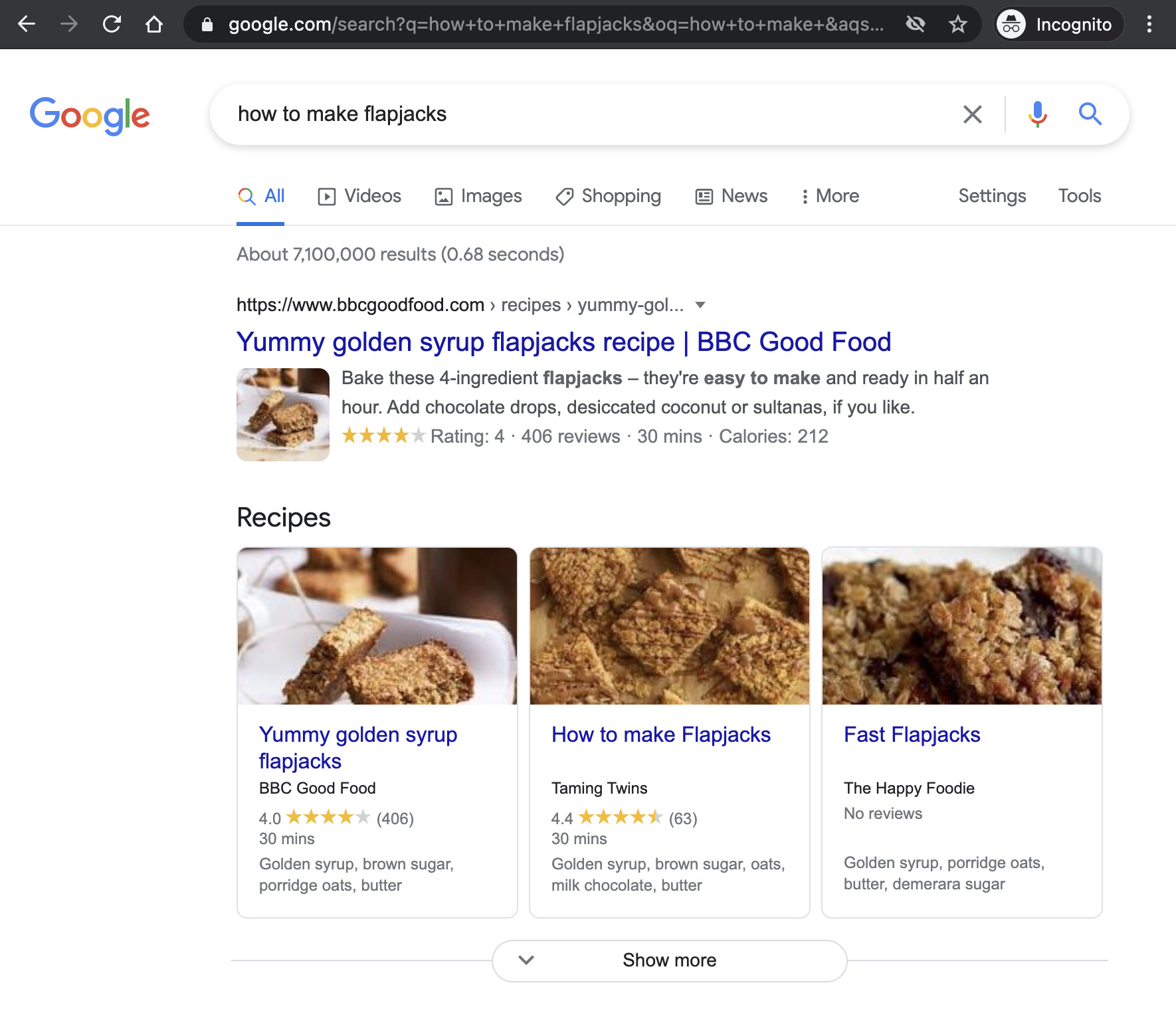 Por ejemplo, aquí puedes ver la búsqueda “how to make flapjacks” en una pestaña de incógnito: