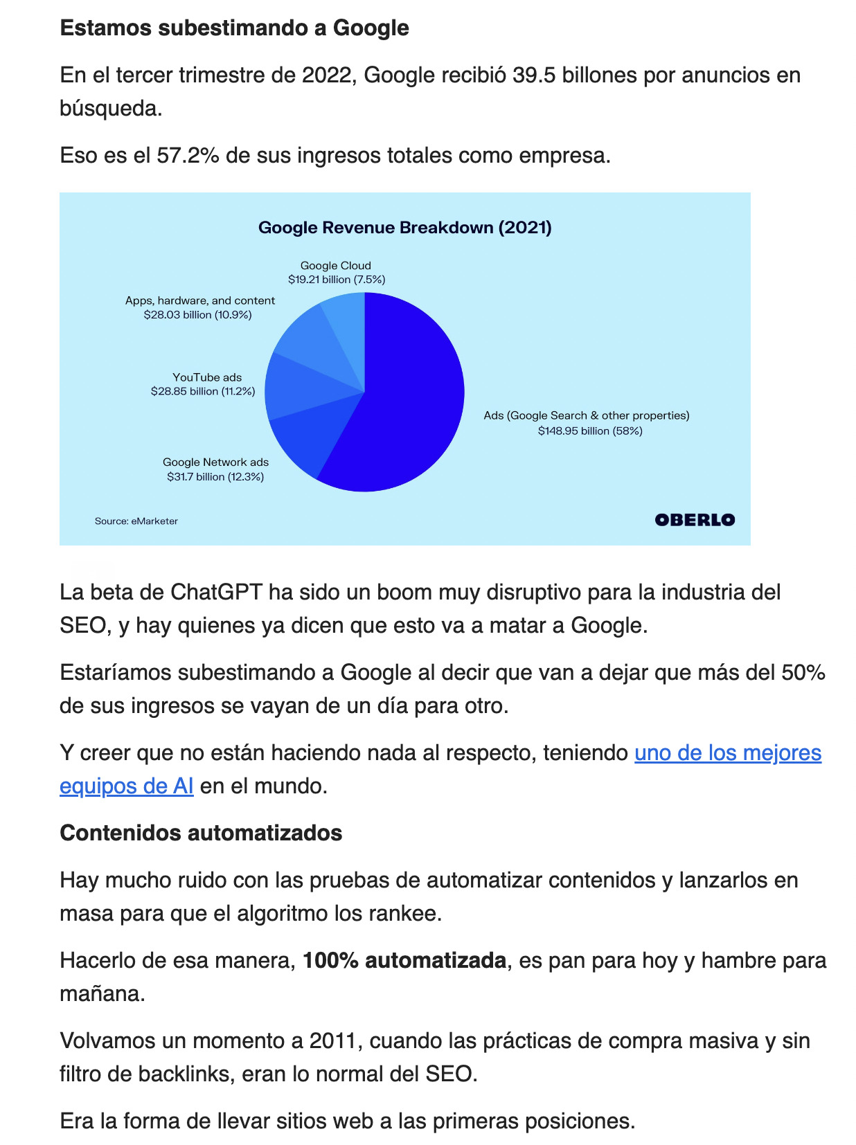 En ese caso, tengo buenas noticias, porque Alejandro recopila resúmenes de las últimas novedades del mundo SEO y además comparte unas estadísticas y analíticas muy interesantes.