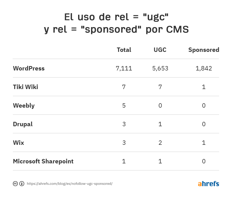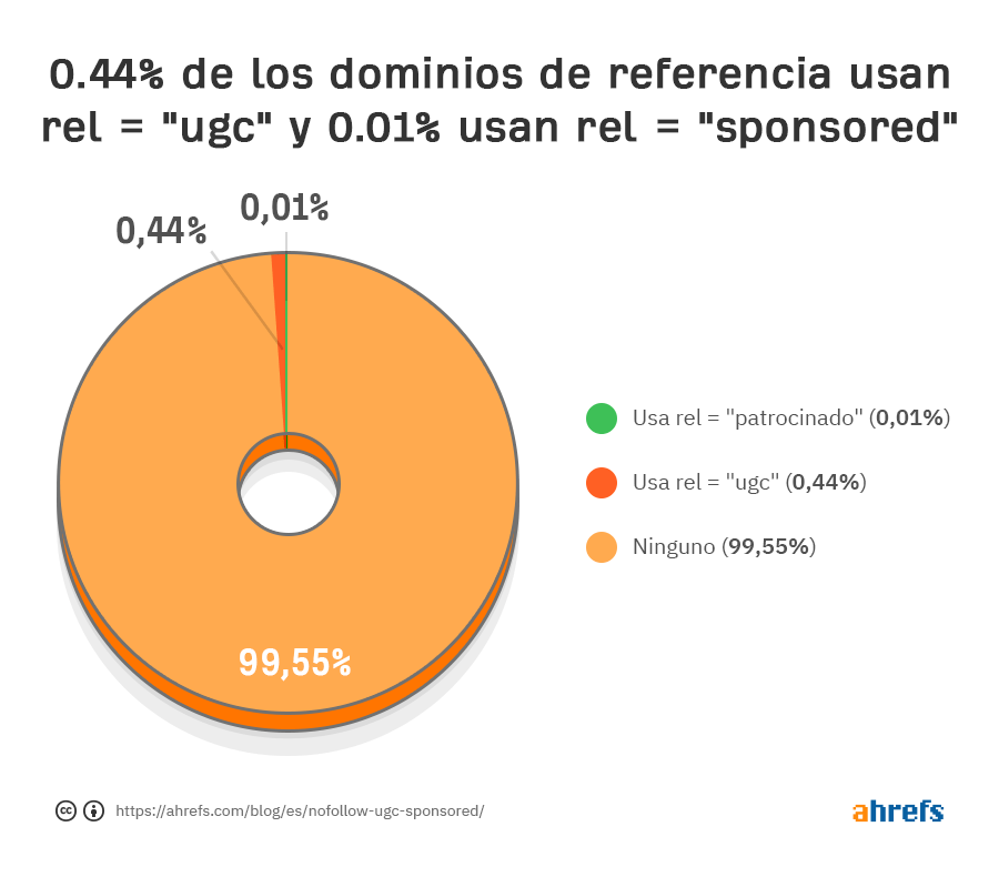 Apenas. Solo el 0.44% de los dominios de referencia a los principales sitios de 110k usan rel = “ugc”, y es aún más bajo con rel = “sponsored” visto en solo el 0.01% de los dominios de referencia. En cuanto al número total de vínculos de retroceso que contienen los atributos, solo el 0.016% contiene rel = “ugc” y solo el 0.008% contiene rel = “sponsored”.