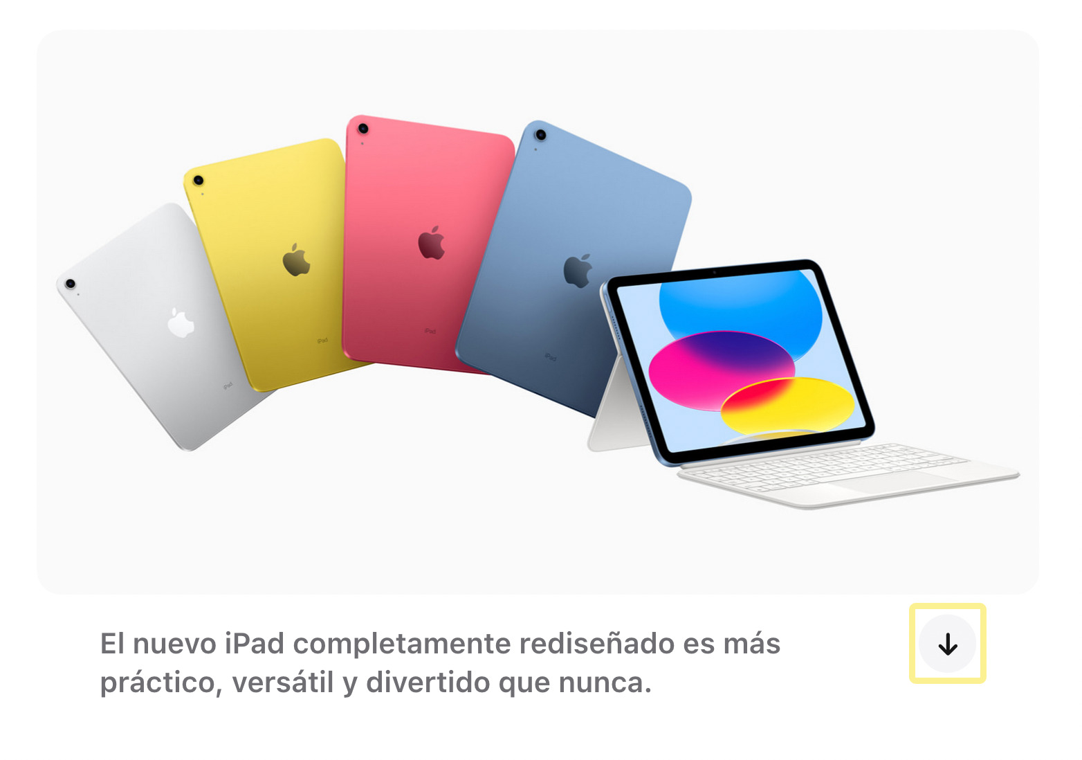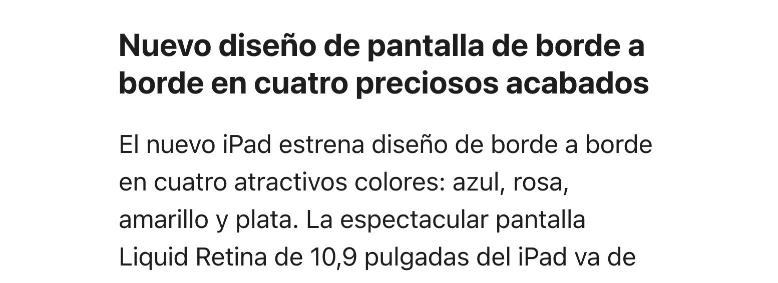 Se abre anunciando el lanzamiento del iPad rediseñado. Los párrafos siguientes analizan el diseño de la pantalla, el nuevo chip y nuevas características, cada uno bajo su propio subtítulo en negrita.