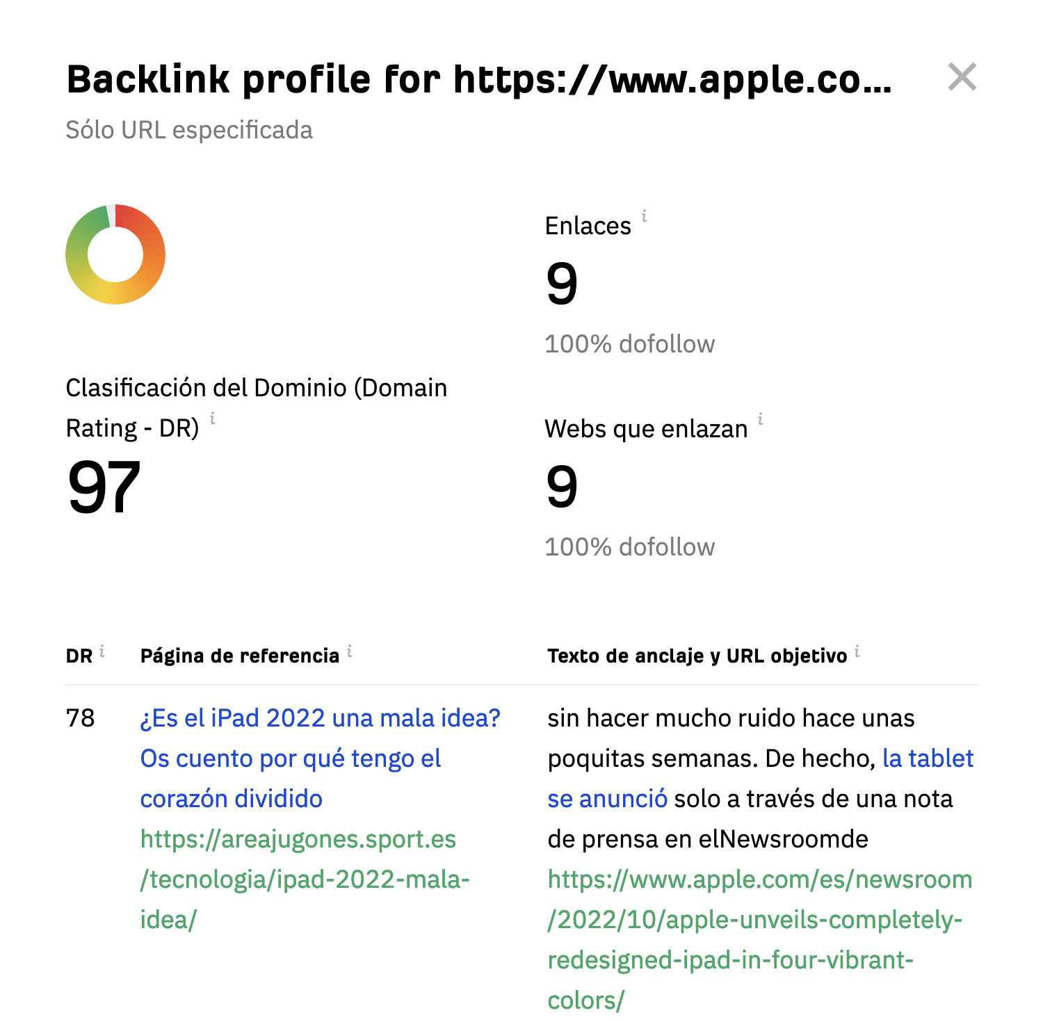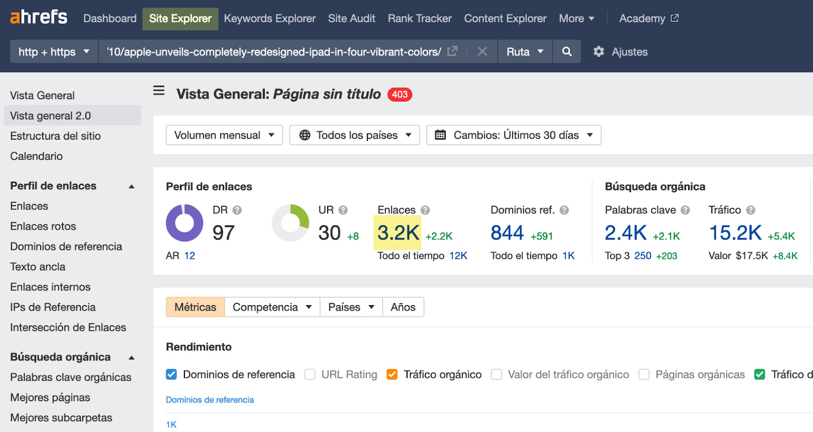 A continuación, en el Site Explorer de Ahrefs, introduce la URL de la página en la que está alojada tu nota de prensa. Desde aquí, podrás ver la cantidad de backlinks recibidos.