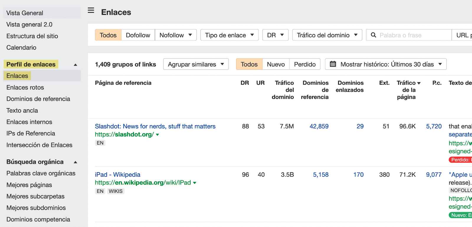 Para obtener un desglose detallado, dirígete al panel de la izquierda y haz clic en Perfil de enlaces > Enlaces. Aquí podrás ver los backlinks “en vivo”, así como recientes e históricos.