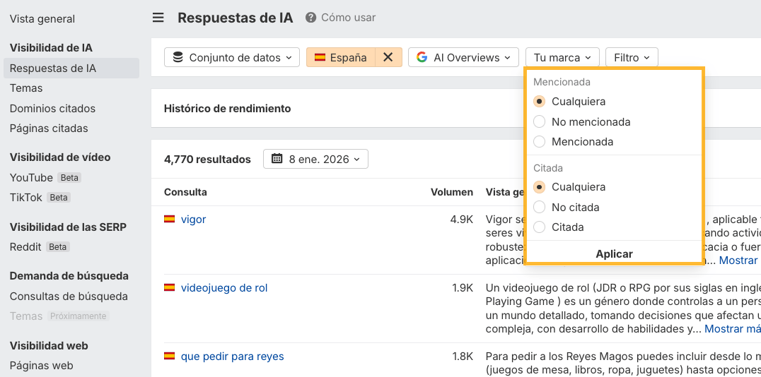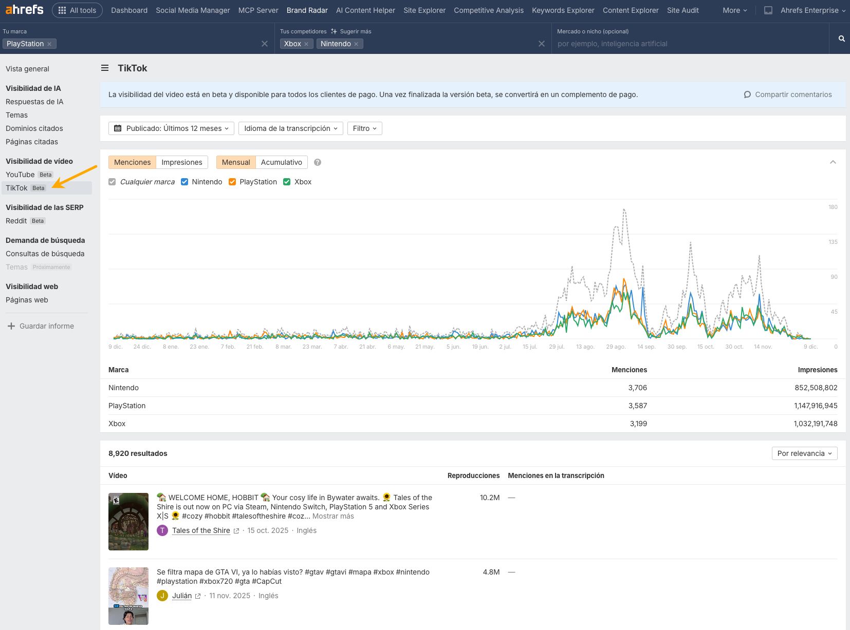 Brand Radar ahora incluye TikTok. La sección de Visibilidad en Vídeo ya cubría YouTube y ahora se suma TikTok, así que puedes ver dónde aparece tu marca en vídeos virales de TikTok.