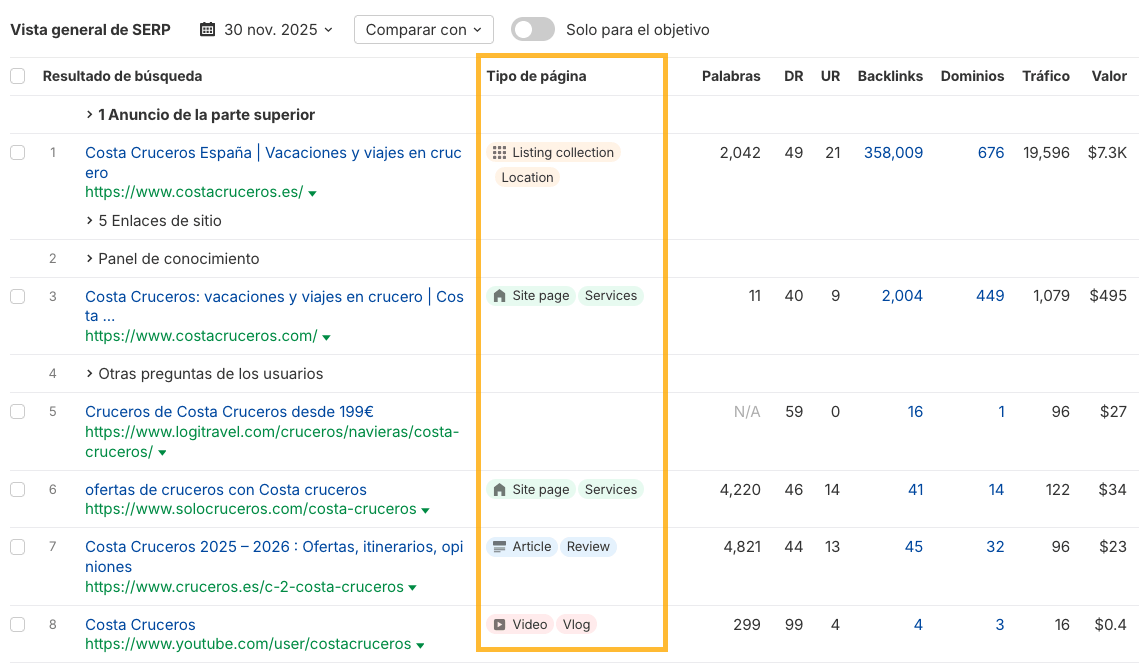 También hay una nueva columna de Tipo de página en la vista general de la SERP.