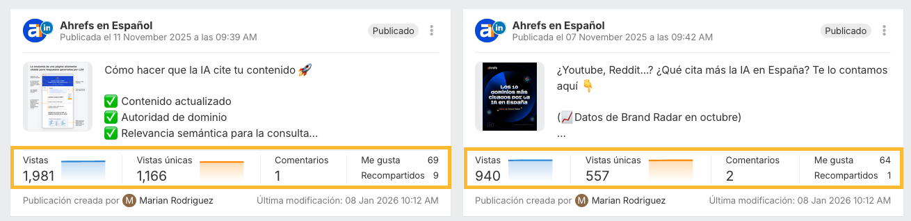 Cada post publicado muestra métricas de engagement como visualizaciones, reacciones y señales específicas de cada canal, todo en un mismo sitio.
