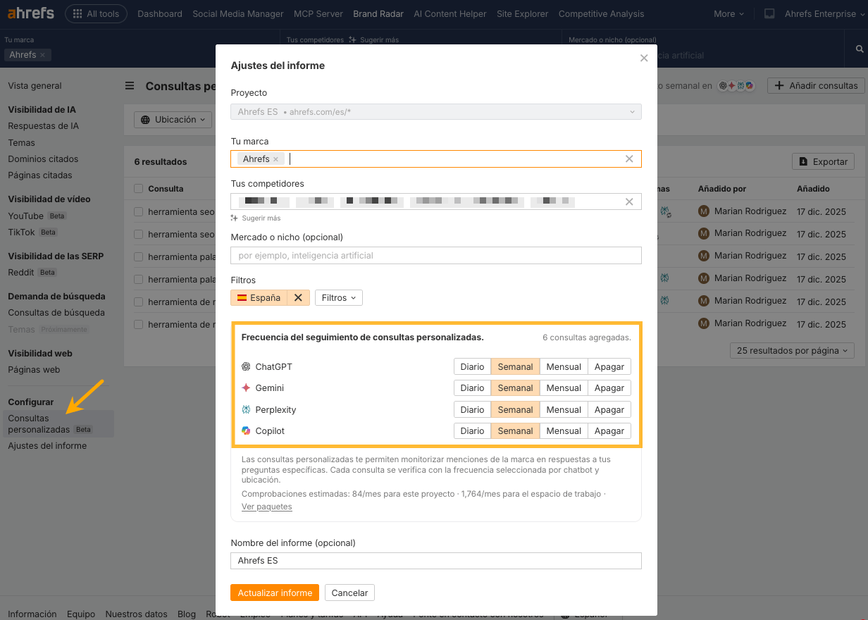 Para usarlo, vincula un informe guardado a un proyecto, define una frecuencia de seguimiento y añade tus consultas personalizadas. Puedes hacer el seguimiento a diario, semanal o mensualmente, con frecuencias distintas para cada chatbot.
