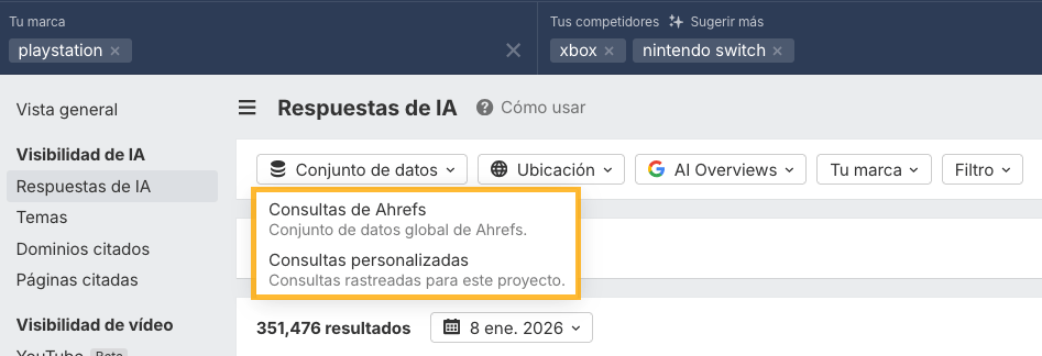 Ahora Brand Radar funciona con dos conjuntos de datos: el conjunto de datos global de Ahrefs y las consultas personalizadas de tu proyecto. Puedes ver ambos en el mismo informe o cambiar entre ellos usando el nuevo filtro de conjunto de datos, según si quieres visibilidad a nivel de mercado o a nivel de comprador.