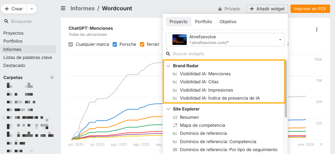Ahora puedes incluir o excluir tu propia marca de las menciones y citas en los informes de Visibilidad en IA con un solo clic. Esto facilita separar la visibilidad de tu marca de competidores o de la categoría.