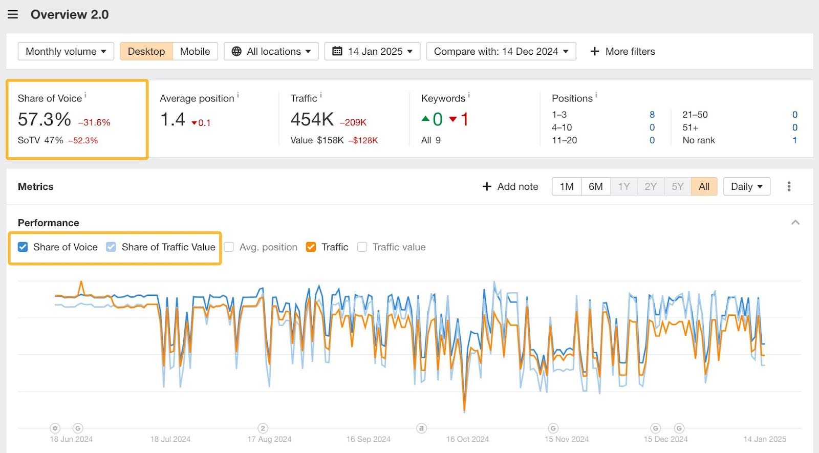Usa las métricas Índice de Presencia y Porcentaje del valor del tráfico para medir la popularidad y la visibilidad de tu marca para las palabras clave rastreadas en la búsqueda orgánica.