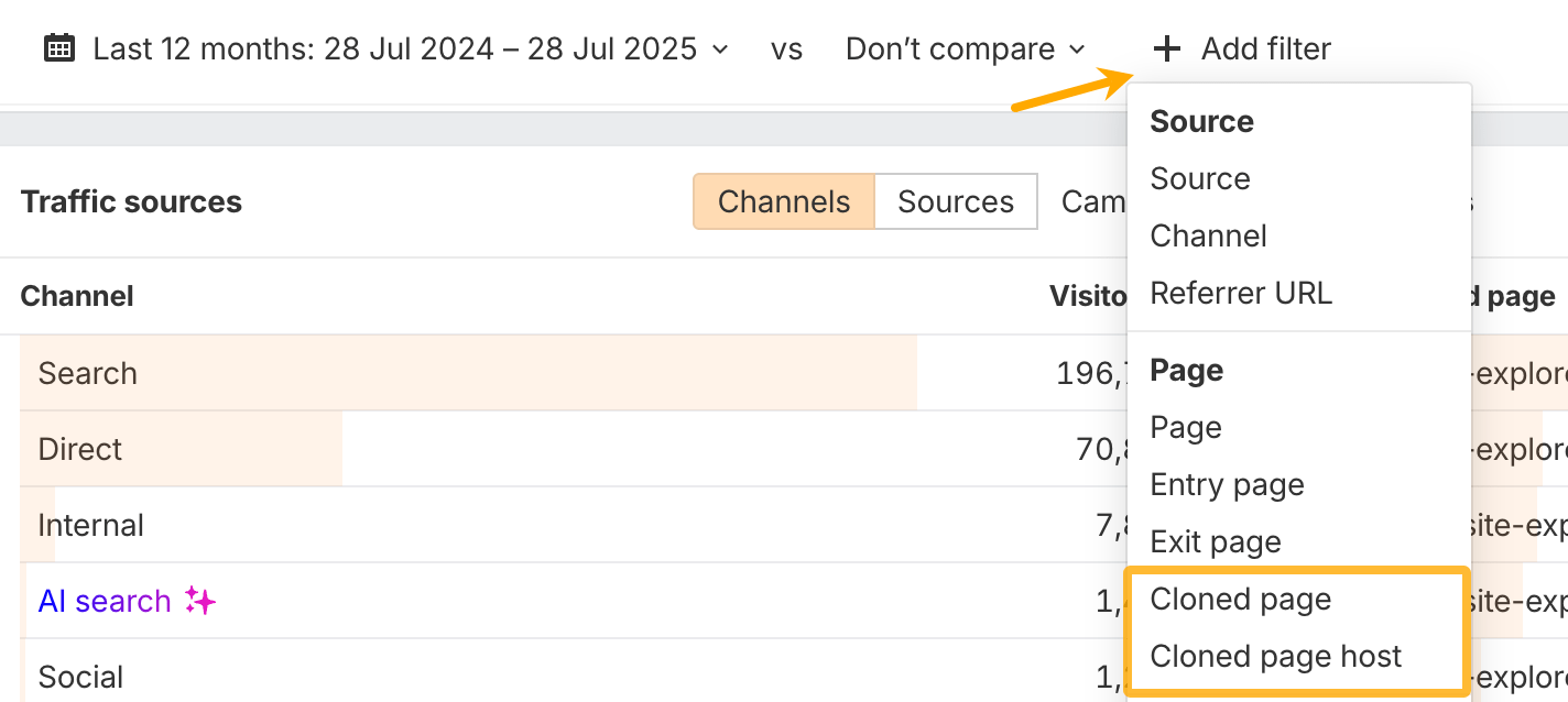 Hemos añadido filtros para páginas clonadas y dominios host para que puedas profundizar rápido.