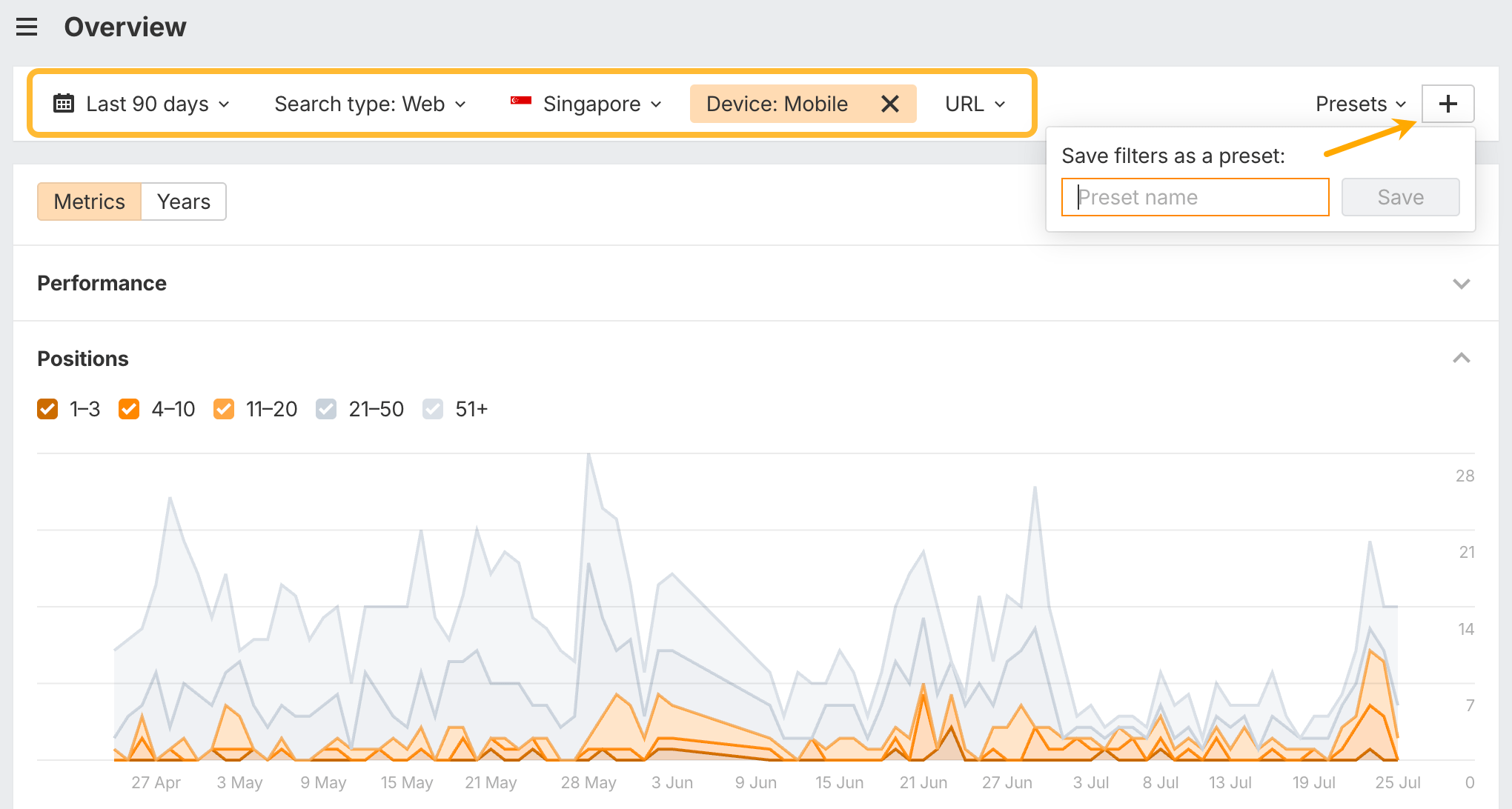 Ahora puedes guardar filtros predefinidos en los informes de Palabras clave, Páginas y Vista general.