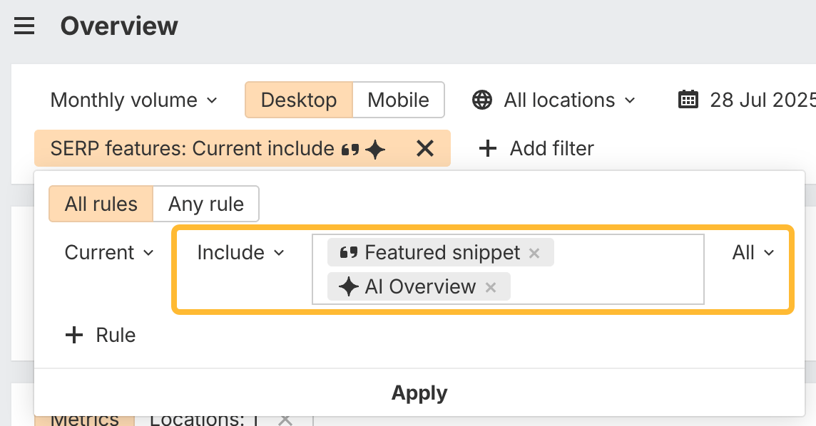 Hemos añadido lógica AND para los filtros de funcionalidades SERP, así que ahora puedes encontrar keywords que muestren, por ejemplo, tanto AI Overviews como Fragmentos destacados.