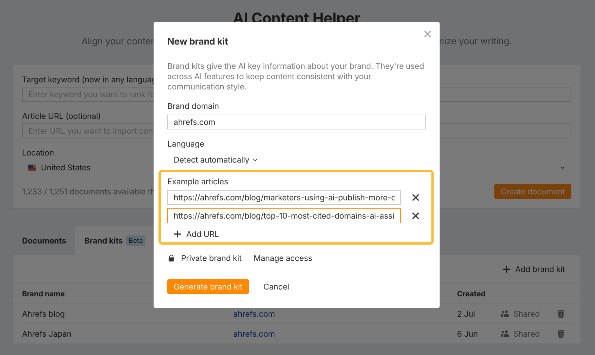 Ahora los kits de marca permiten añadir artículos de ejemplo. Agrega algunos al crear un kit para entrenar a la IA con tu voz, tono y estructura, y así obtener borradores más consistentes.