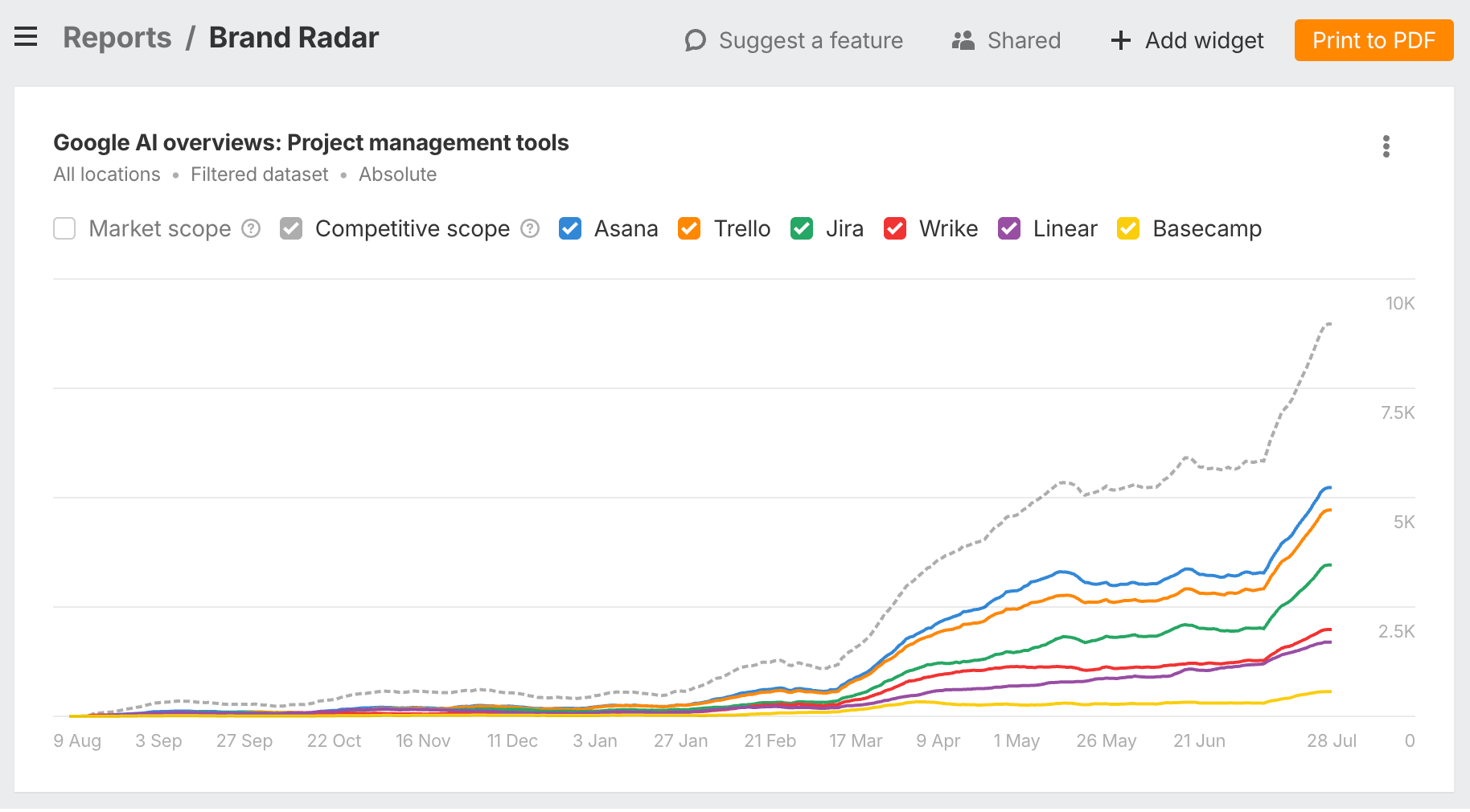 Brand Radar acaba de recibir su primer widget: un gráfico histórico de menciones en Google AI Overview. Ponlo en cualquiera de tus reportes.